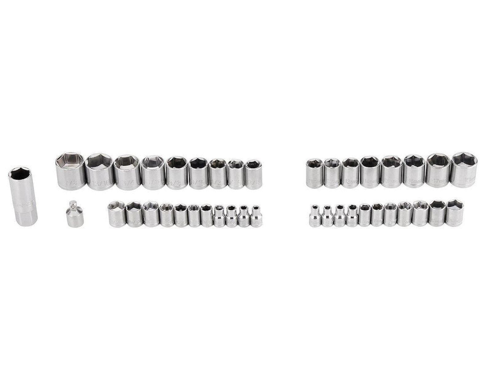 - Contains (40) 1/4 in., 3/8 in. sockets, (2) socket ext., (10) combo wrenches, (10) screwdrivers, (4) pliers, (16) hex keys, (40) screwdriver bits, 3/8 in. ratchet, screwdriver bit driver, adjustable wrench, socket adapter, tape measure, hammer, hardware kit