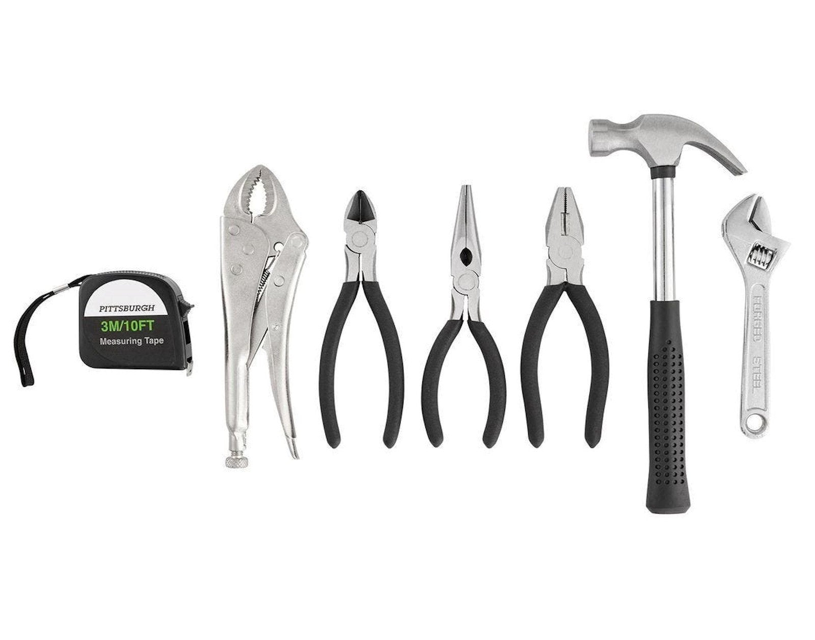 Included in the set is a Hammer, screwdrivers and driver bits, wrenches, and socket set, Pliers, cutters, and locking pliers, Tape measure, hex wrenches, and precision screwdrivers along with a set of commonly used fasteners and anchors