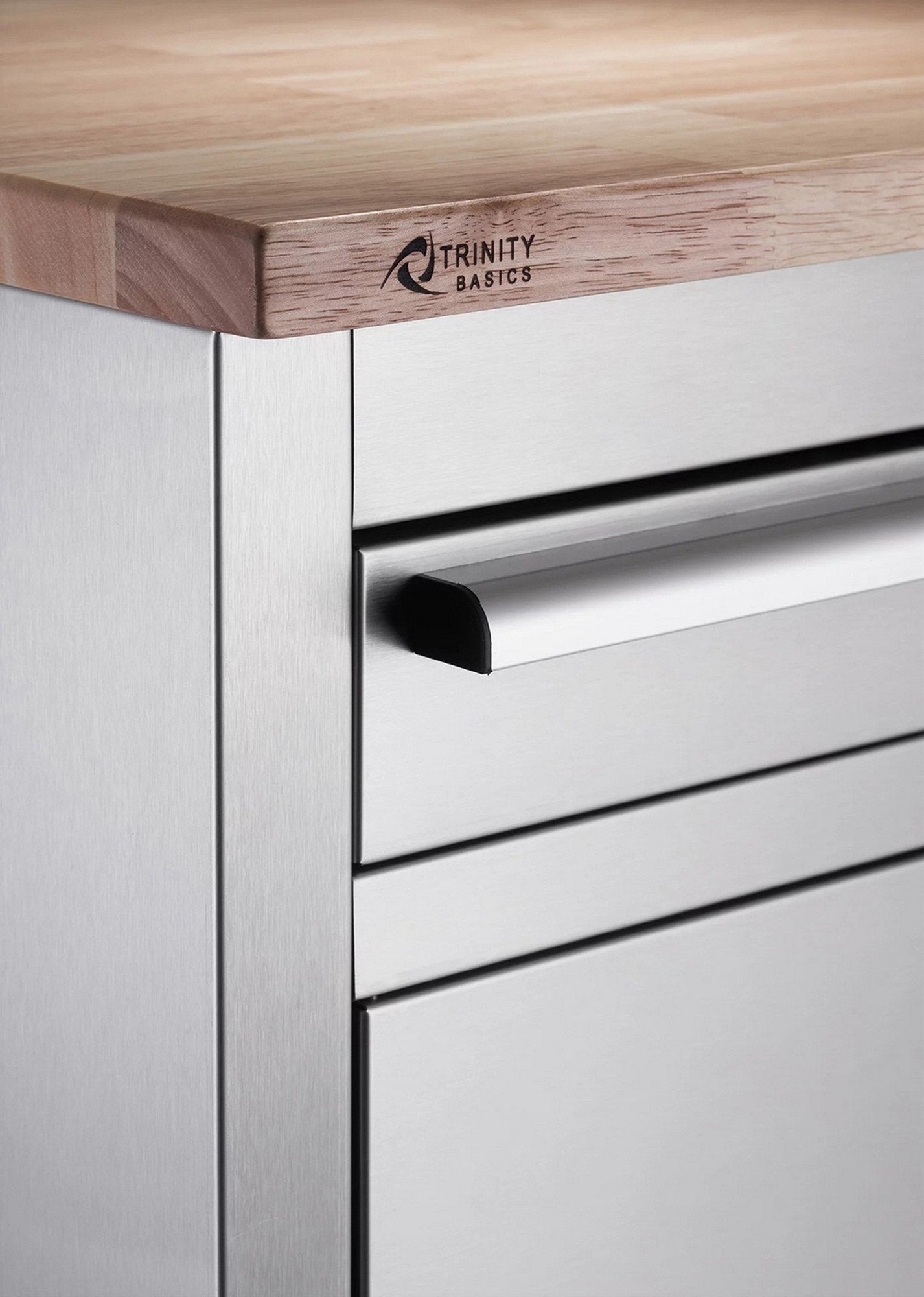Trinity Basics 31" stainless steel rolling workbench's compact design is perfect for small workspaces or storage areas. This versatile unit can hold your tools, office supplies, crafting materials, or even pet supplies. The full-length drawer is perfect to organize small hand tools. The cabinet can be used to store large equipment and a pegboard to hang items and supplies reducing the clutter in your work area. The drawer is equipped with 75 lbs. weight capacity ball bearing slides, pre-cut drawer liners for both drawer and cabinet, and 5" x 2" wheels for easy maneuverability.