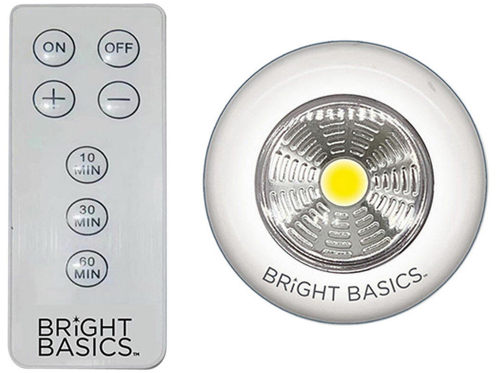 The Bright Basics Ultra Thin Wireless LED Puck Lights give you ultra bright lighting up to 100 lumens with a cool white glow. The wireless remote control offers you the ability to control each individual light or all 6 lights at one time. The puck lights are easily mounted with the included adhesive tape so you don't have to worry about needing any tools. Each light operates on 3 AAA batteries, and the remote control operates on 2 AAA batteries. It's the perfect affordable option for adding more lighting to your closets, cabinets, shelves, garage, or anywhere else in your house that can benefit from some bright cool white lighting.
