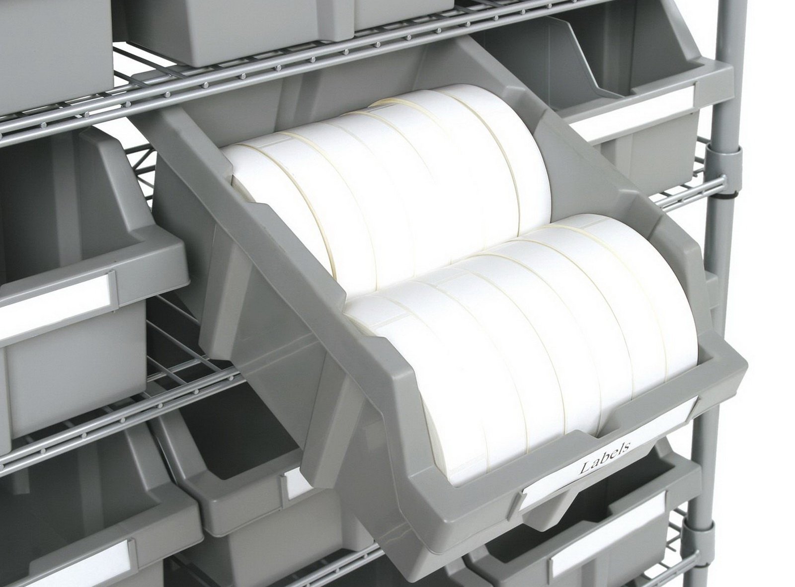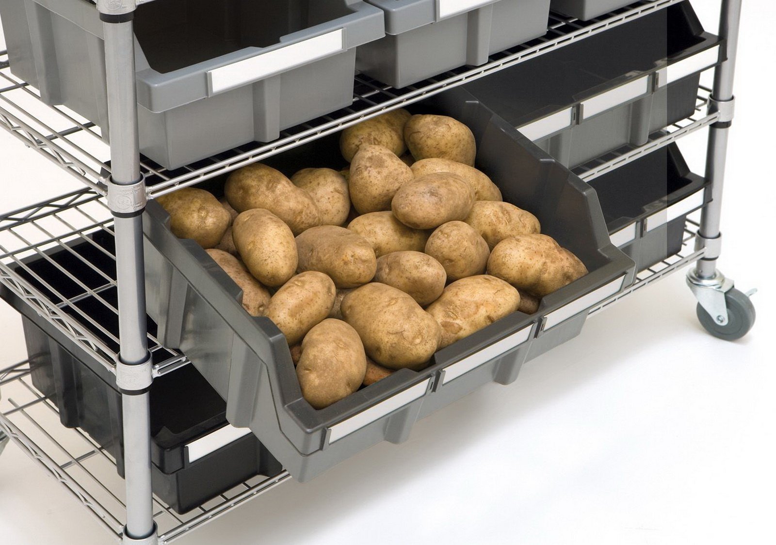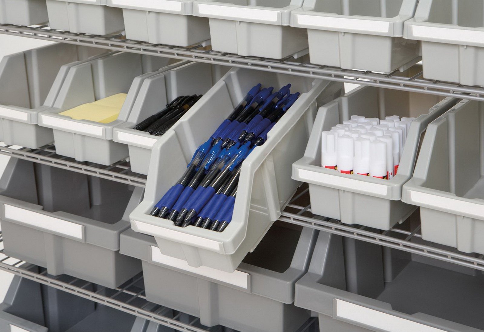 - Metal Rack with Grey Plastic Storage Bins