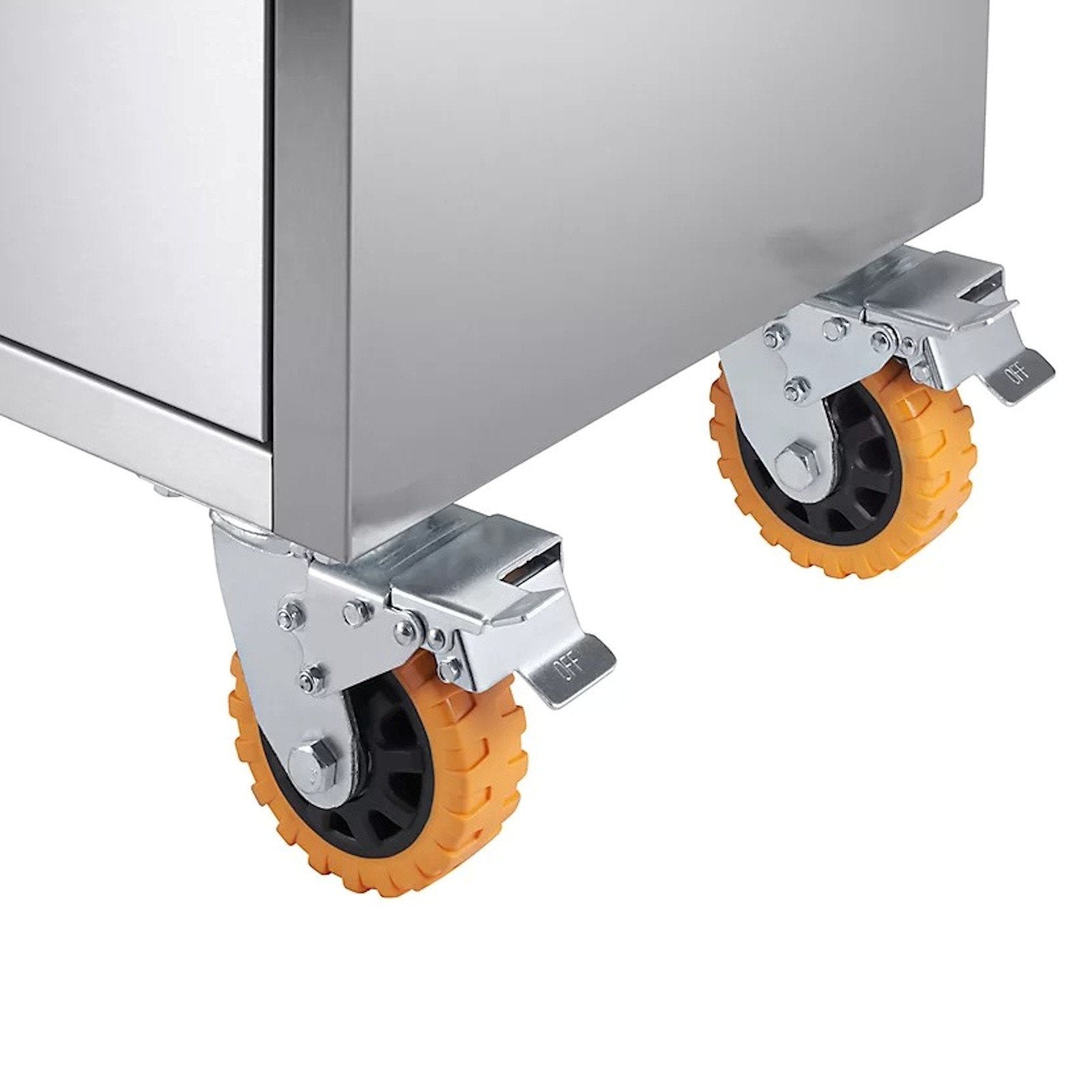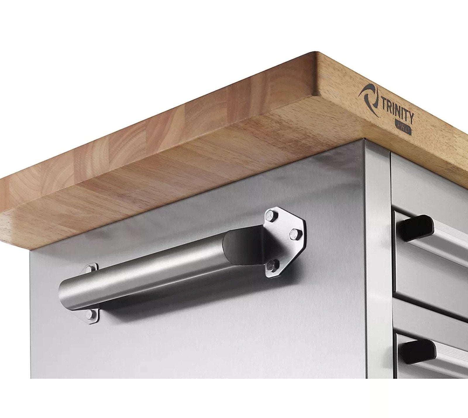 Trinity's gray steel frame, stainless steel 72" rolling workbench provides all your garage, basement, or kitchen storage needs. Its drawer layout ensures room for large and small tools. Each drawer is equipped with 100 lbs. of weight capacity ball bearing slides, and the heavy-duty 5" x 2" wheels provide easy maneuverability. The 1.5" thick rubberwood top provides a sturdy work surface for any job.