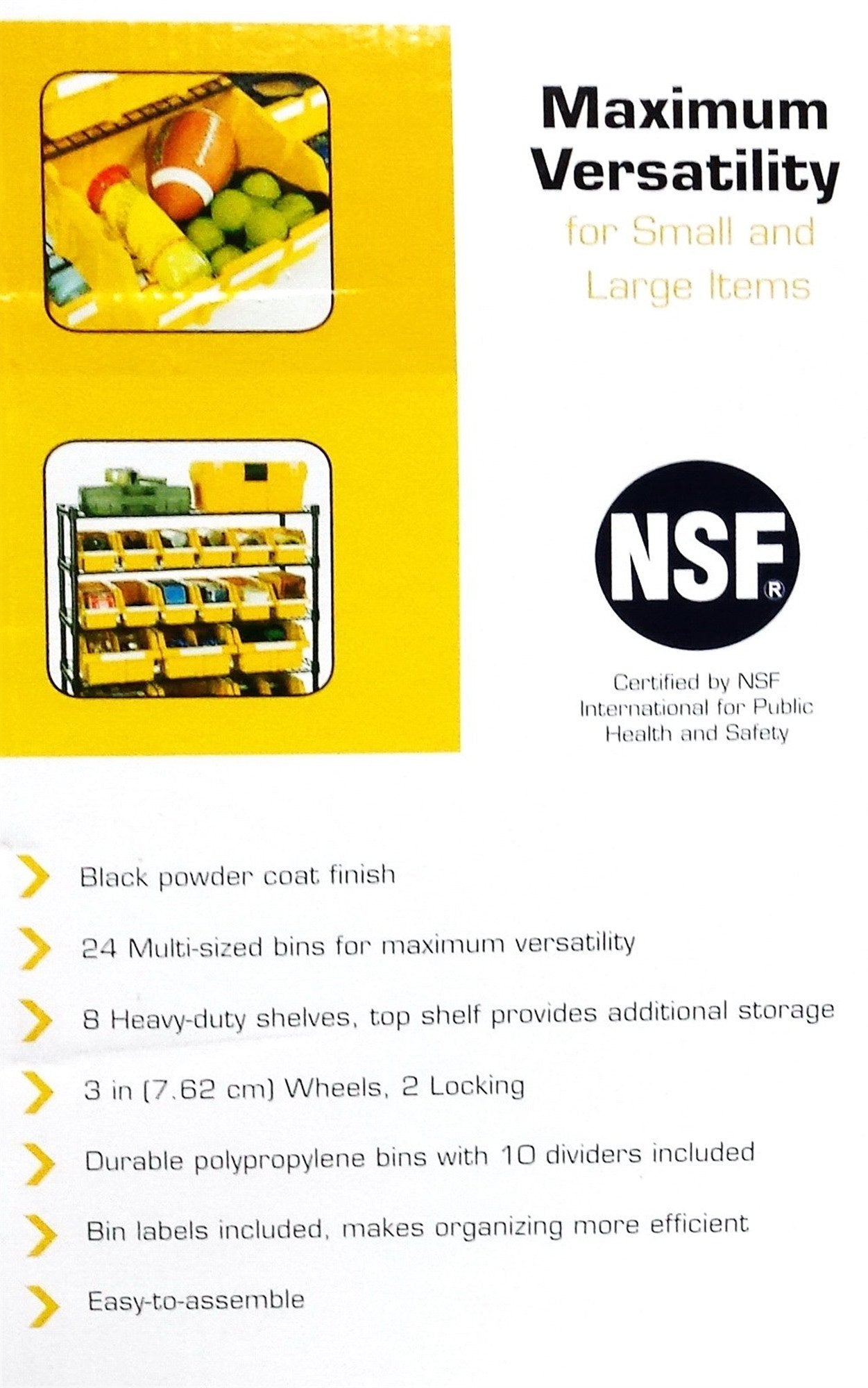 The 24 count polypropylene bins are made to slide out easily and lock for safety and convenience. The unit comes with 10 removable bin dividers to help separate smaller items and four 3" caster wheels which allow you to move the rack with ease. Two of the wheels lock for stationary use and safety. If you are looking for permanent placement, this unit also comes with four leveling feet.