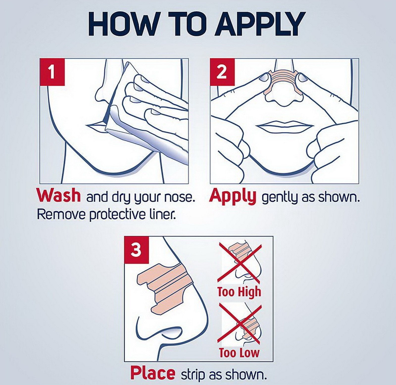 Before you apply Breath Right Nasal Strips, it's important that you wash and dry your nose and hands well to make sure that all dirt, oils, moisturizers and makeup are cleared from the surface. Next, remove the adhesive backing and place the strip across the bridge of your nose. The tabs on the strip should rest just above the flair of each nostril. Finally, press down on the nasal strip and hold until it is secure on your nose. To remove, use warm water to loosen the strip, and gently lift from each end until detached.