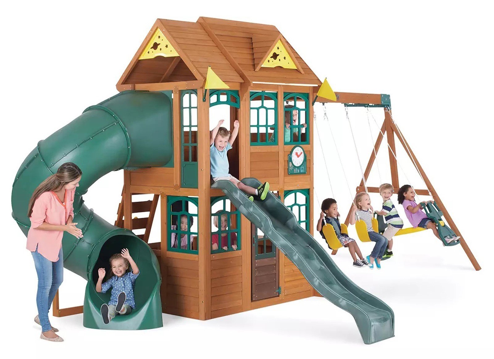 KidKraft Charleston Lodge Wooden Swing Set The sturdy Charleston Lodge Wooden Swing Set by KidKraft is built to take whatever ten rambunctious kids can dish out. Each all-in-one activity center and playhouse features not one, but two durable slides–an extra-deep high-rail wave slide and an enclosed 12’ Twist N’ Ride tube slide. A multi-colored climbing rock wall provides access to the upper level of the two-story clubhouse. Outside, a solid swing beam with an extra-wide A-frame anchors two heavy-duty belt swings and a premium glider for one or two.