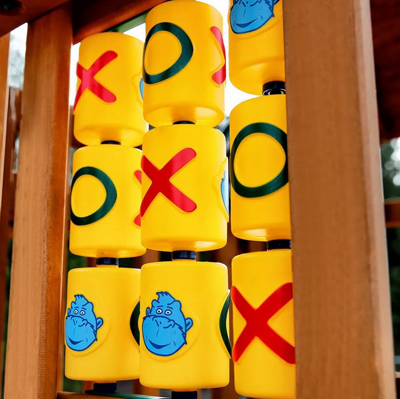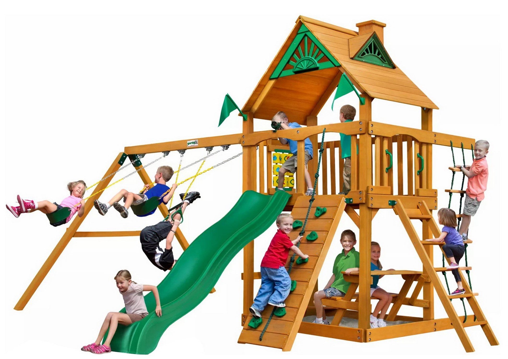 - Includes: Swingset, Wave Slide, Rock Wall with Climbing Rope, Deluxe Rope Ladder, Entry Ladder, 2 Belt Swings, Trapeze Swing, Built-in Picnic Table, Sandbox, Tic-Tac-Toe Panel, Steering Wheel, Telescope