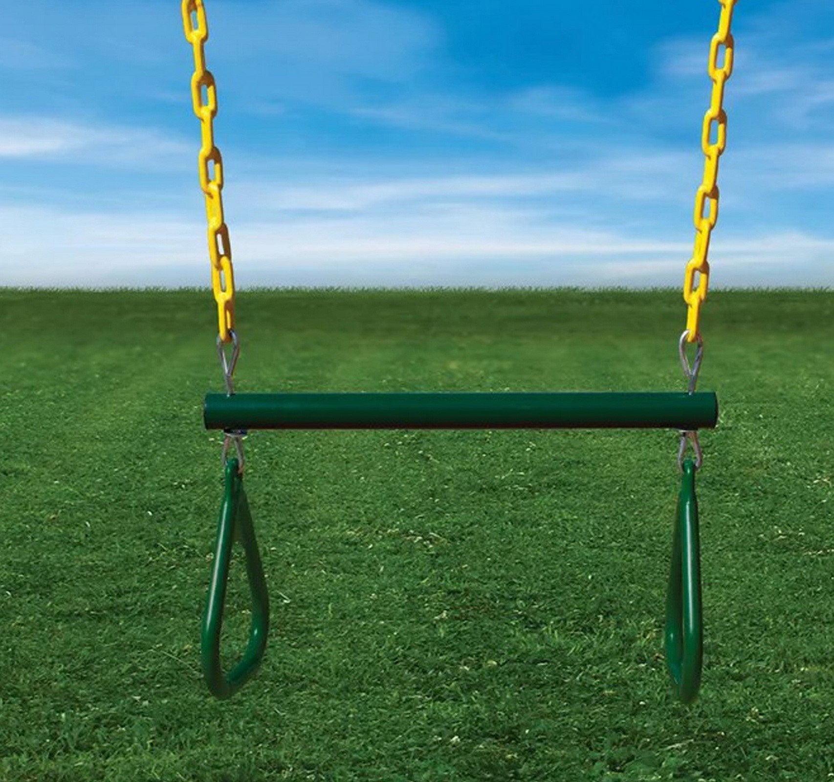 - 2 belt swings and a trapeze swing with plastic-coated safety chains