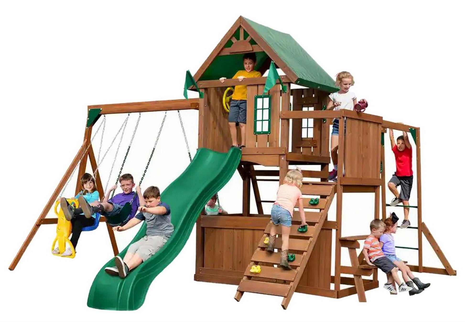 Add this Knightsbridge Wood Complete Swing Set to your home playground. It includes a rock-climbing wall with rocks, an 8-ft. Alpine wave slide, an entry ladder, a wind rider glider and two standard duty swing seats. For more fun, it provides monkey bars with metal rungs, a picnic table, a 22-sq. ft. play deck, a steering wheel and a telescope. You can easily assemble this playset in your backyard. Built for durability, it offers rot, decay and insect-resistant cedar wood construction. A green canopy delivers protection from weather elements while providing shade.