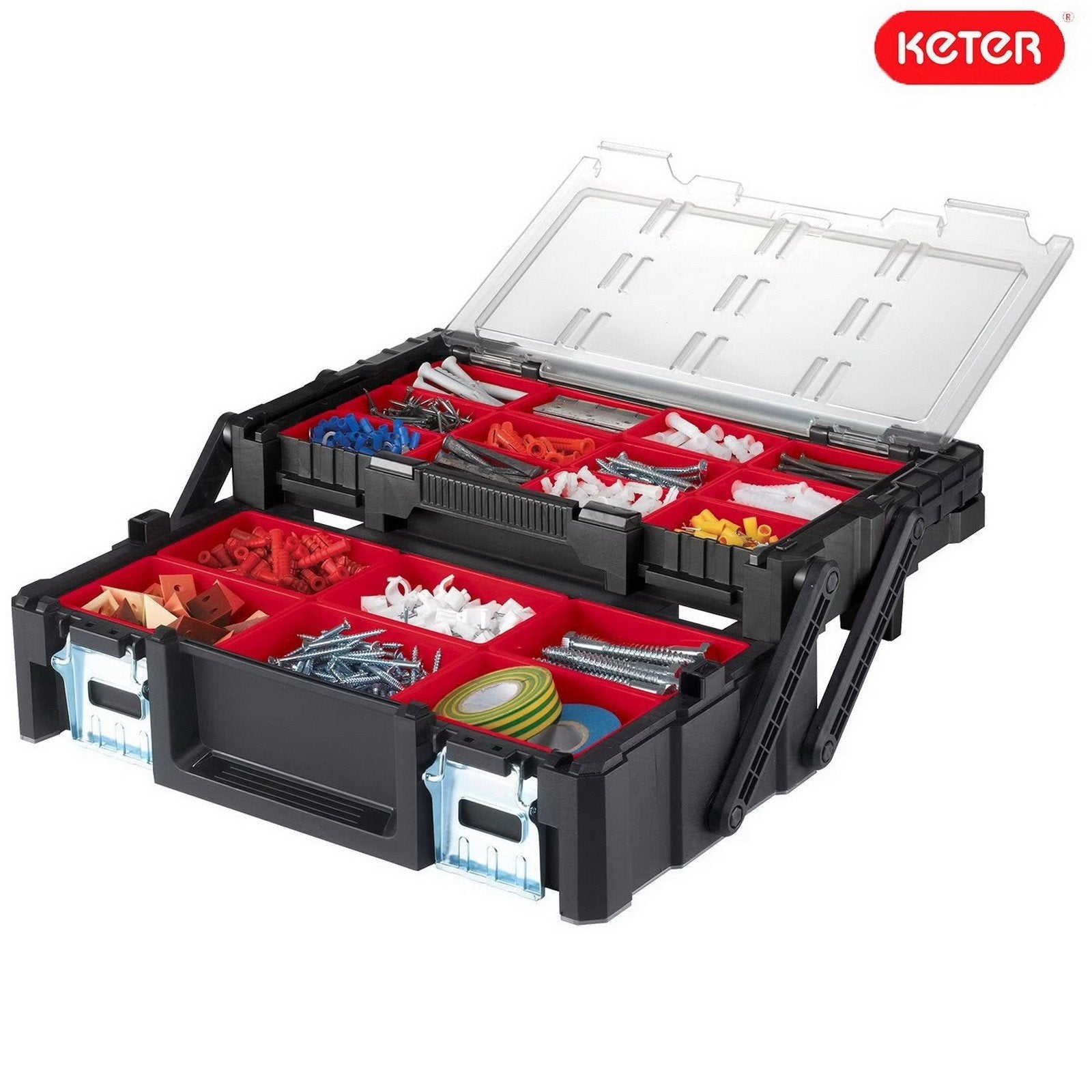 - The cantilever organizer is a heavy-duty construction that is easy to carry with metal latches to keep your items secure.