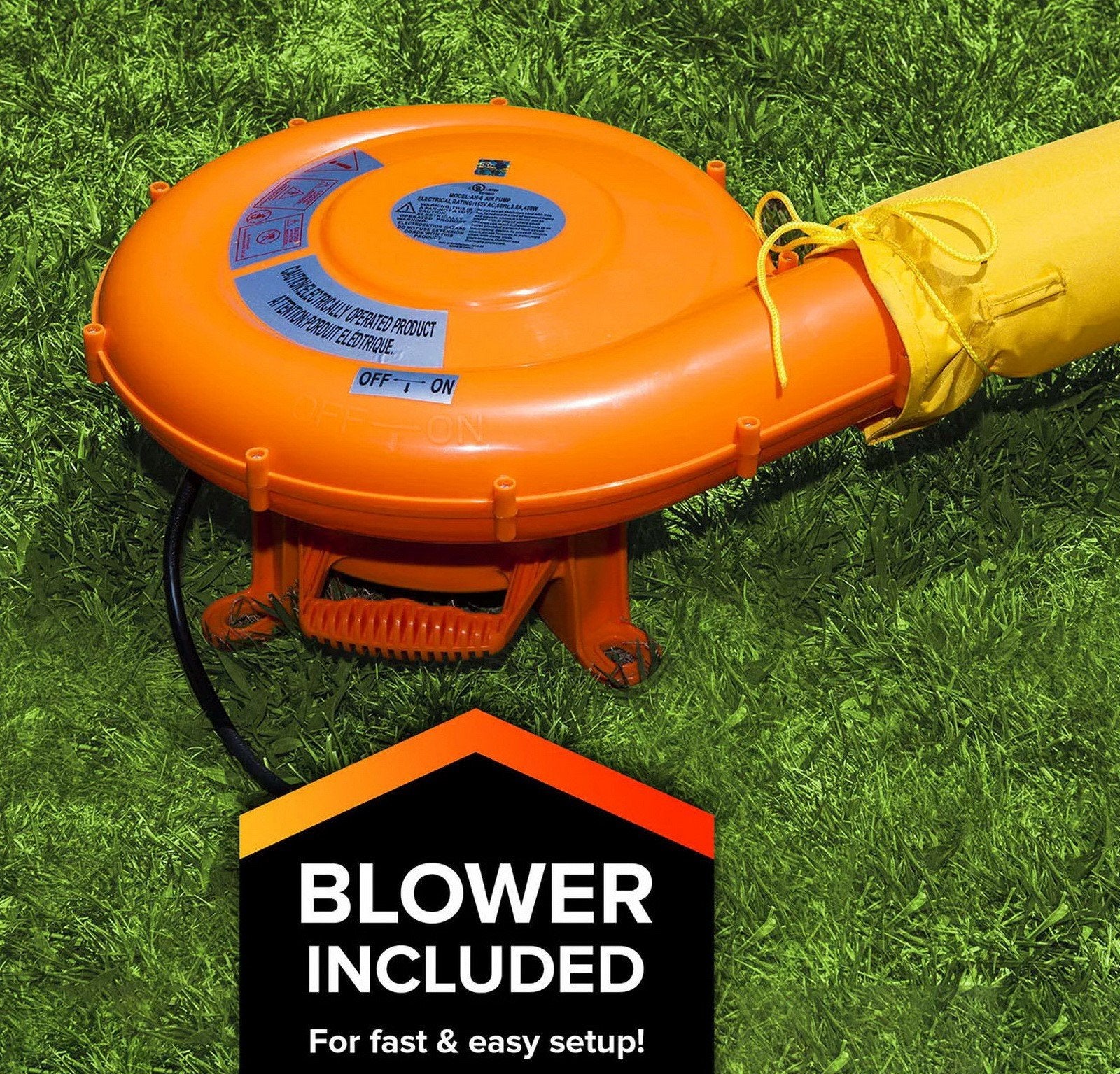 This curved water slide provides an exciting trip down to a large splash pool. It's large enough for multiple kids but with a compact footprint, it's easily supervised by parents. The climbing walls are easy to go up with foot holes, hand grips, and safety walls. Stake anchors help keep the air bouncer stable, and a continuous air blower is included for the constant inflation required. Easy to take down and store, the Splash 'n Slide provides hours of fun for hot summer days. Adult supervision is always recommended. Meets or exceeds ASTM safety standards.