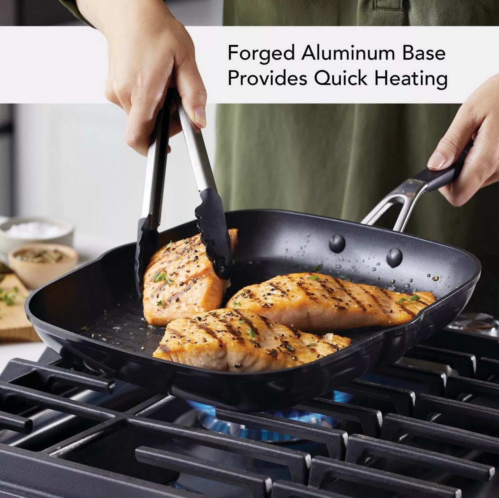 Finished with triple layer nonstick, these saucepans, frying pans, stockpot, and square grill pan effortlessly release foods and clean like new. Dual riveted stainless steels handles are finished with silicone grips to remain cooler when cooking when compared with traditional stainless steel handles, while the tempered glass lids lock in heat and flavor.