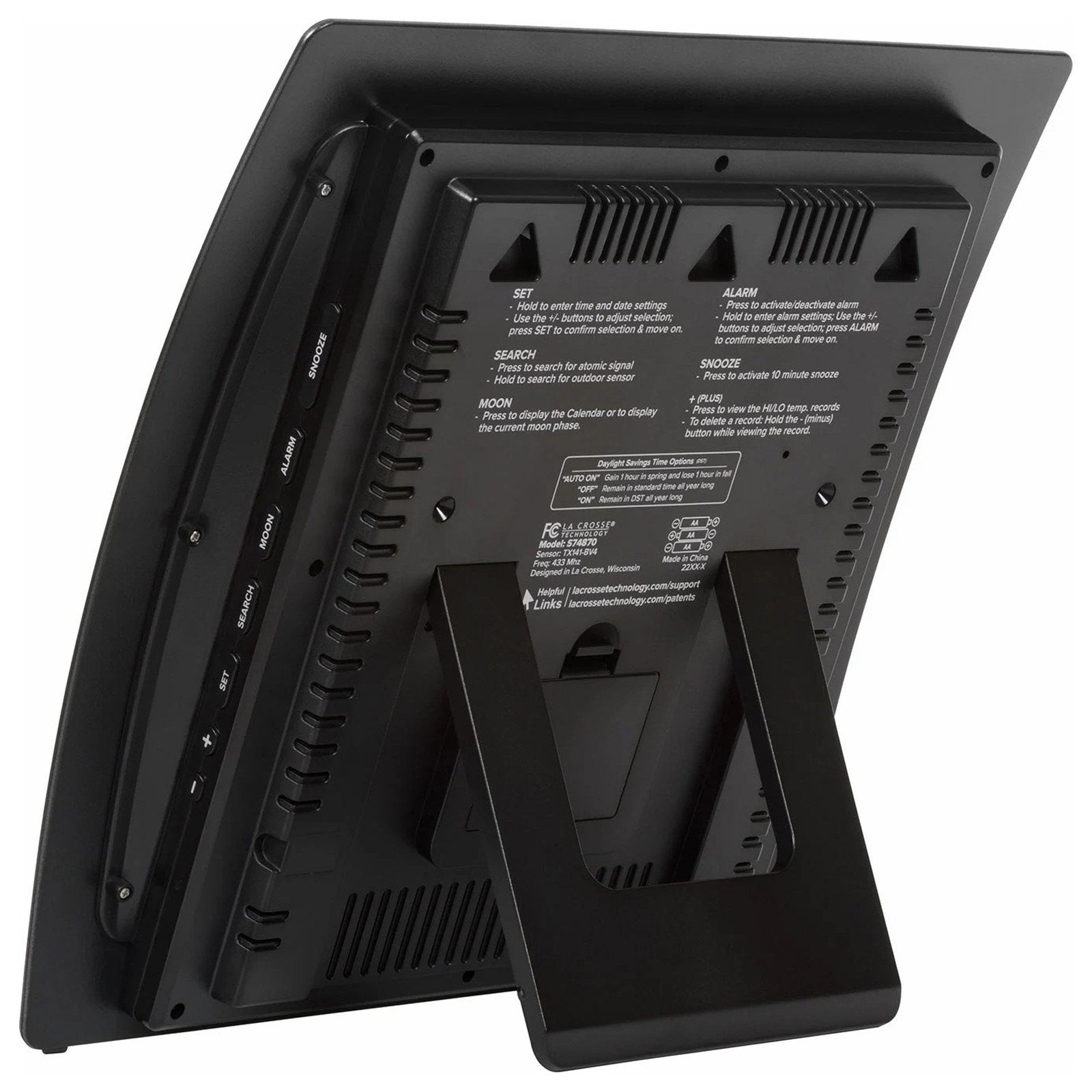 The dual LCD design features large, 3” tall time digits, an easy-to read calendar display with full day of the week, and oversized temperature values. Use the adjustable easel stand to place the clock on a table or desk, or mount to a wall using the hanging holes located on back.
