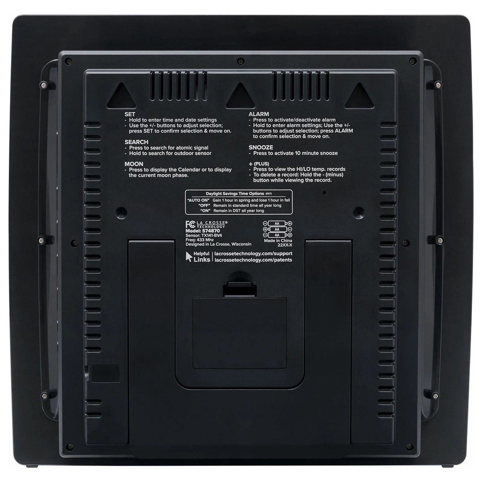 - Power Requirements: 5 “AA” Batteries (3 for Clock; 2 for Sensor) (not included)