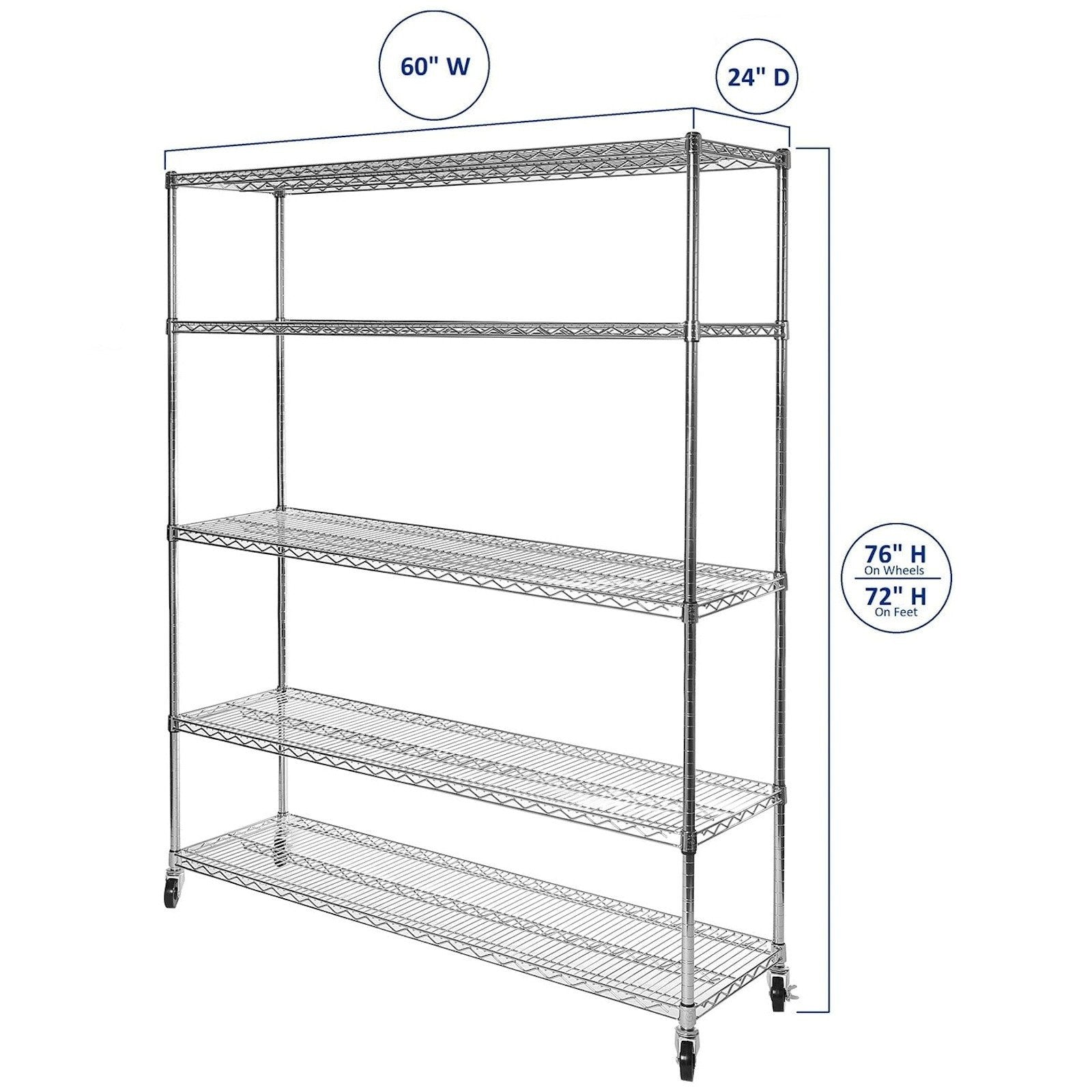 This is for one Brand New 5-Tier Storage Shelving Rack. At 24 inches deep and 60 inches wide, shelf space is abundant. Shelf height can easily be moved up or down in one inch increments giving you just the right height between shelves. Four caster wheels allow for easy maneuverability and placement in your room. NSF listed means it's safe in any food environment.