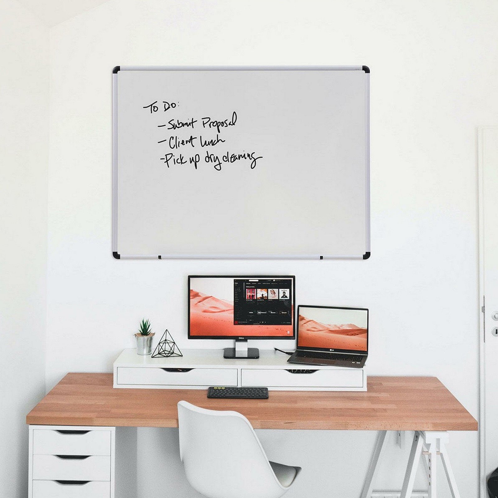 Stylish wall-mountable board is an indispensable office addition that's perfect for occasional use. Melamine surface accepts all dry-erase markers. Contoured aluminum frame features attractive, protective black-plastic corners. Extra-wide marker/eraser tray. May be mounted vertically or horizontally.