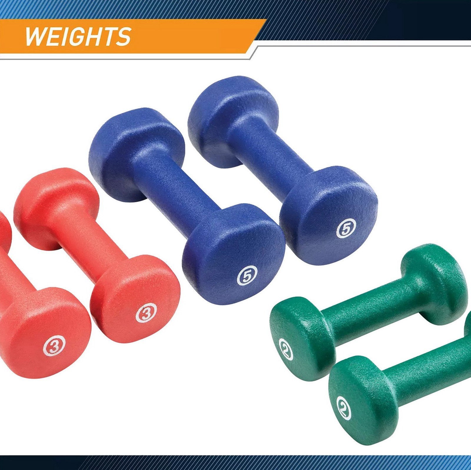 - Includes pairs of 2 lb, 3 lb, and 5 lb weights