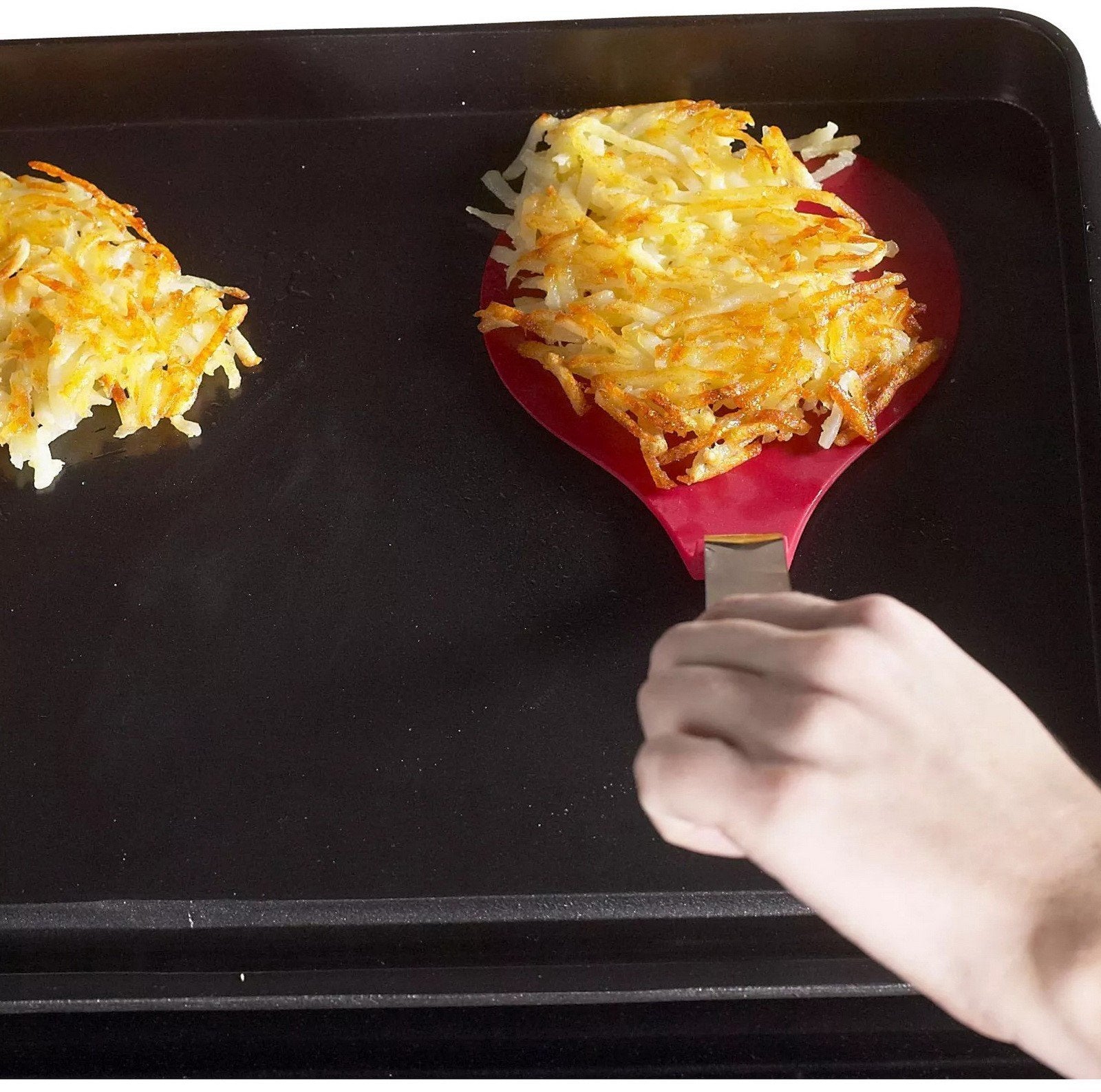 Tall sides keep splatters inside the griddle and off of your stovetop for mess-free cooking, and they serve a secondary purpose too; when flipping slippery foods such as fried eggs or sausage links, push the food up against the tall sidewall with a spatula to keep it from scooting away across the surface of the griddle as you try to handle it. For use on gas, electric and glass top stoves, as well as outdoor grills over medium to low heat. Sized for 2-4 portions of most foods. Proudly made by Nordic Ware, a family owned company.