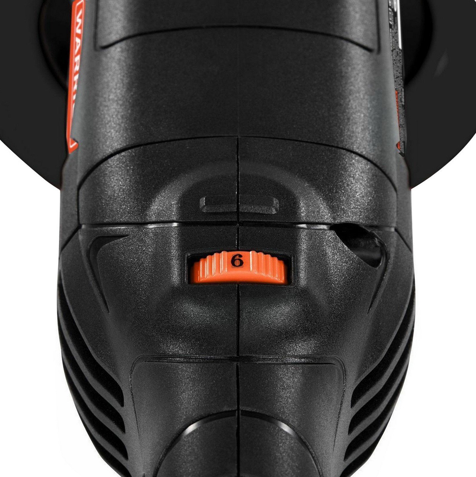This variable-speed rotary Sander Polisher delivers up to 3500 RPM for fast results and precise control. The 2 handle options: a D-style loop grip or a dual-position side handle, give plenty of options for comfort and control. A convenient trigger grip has a handy lock-on button for extended use.