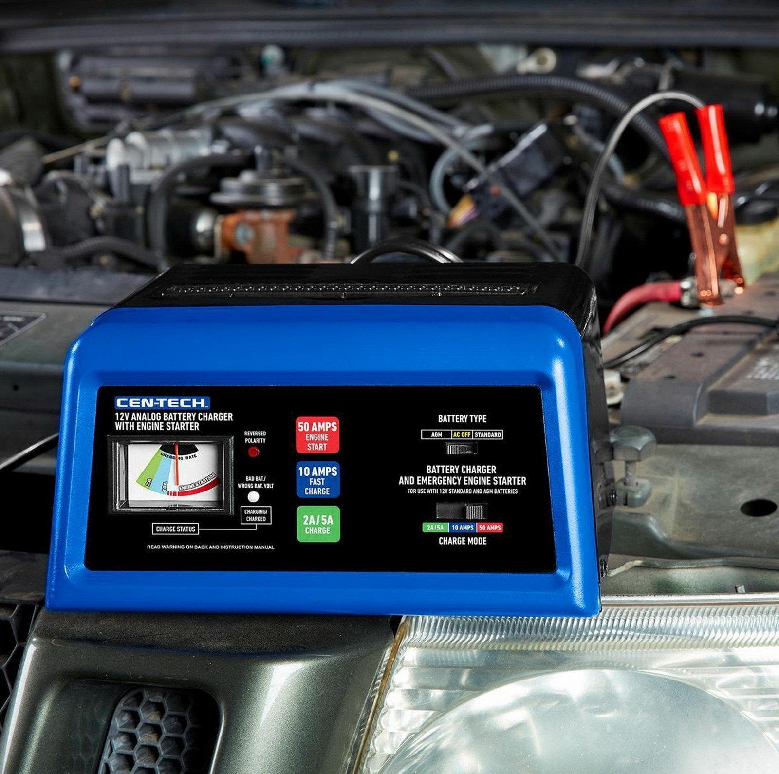 - This 12 volt car battery charger/engine starter has three modes for charging, fast charging, and starting.