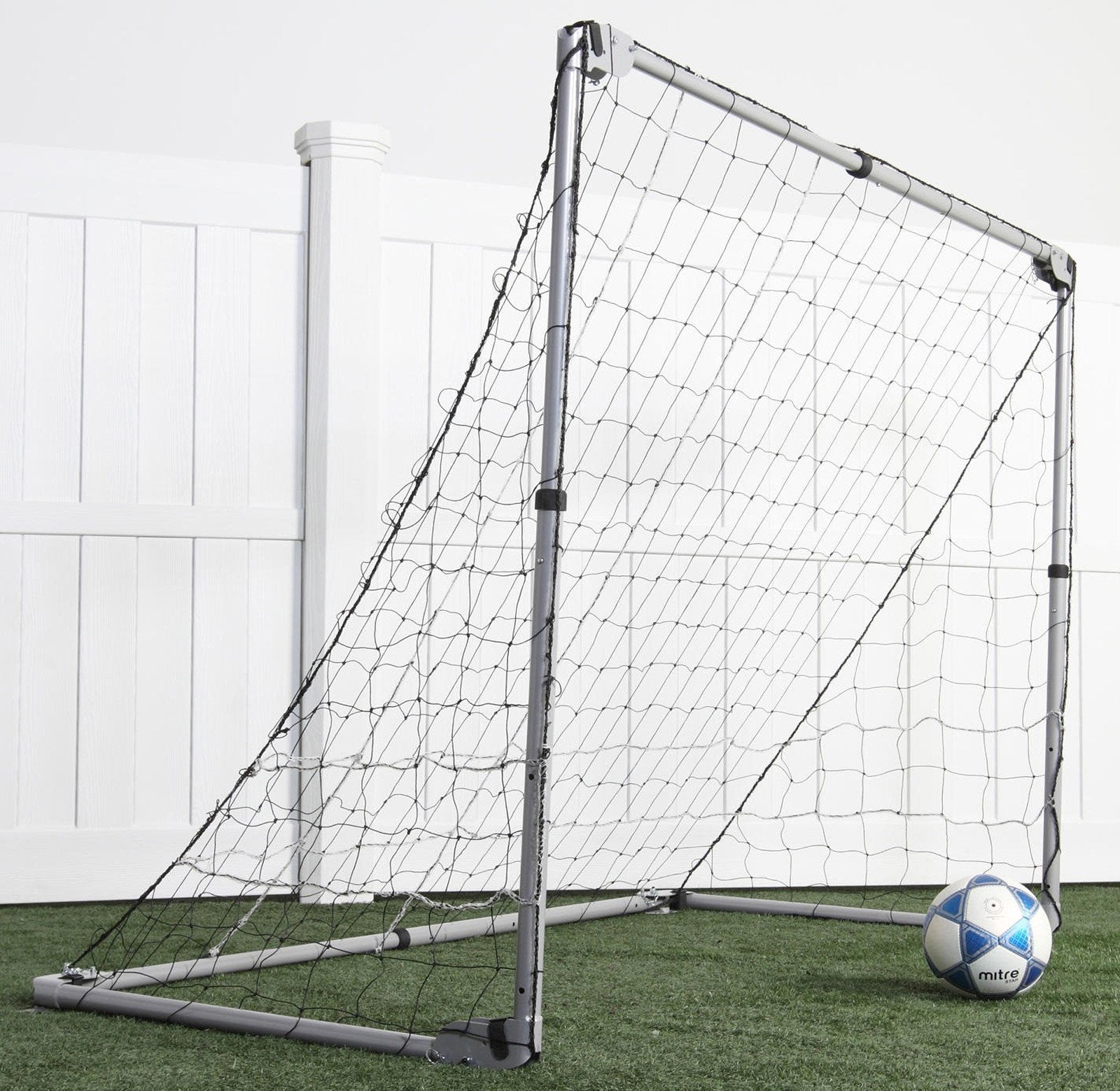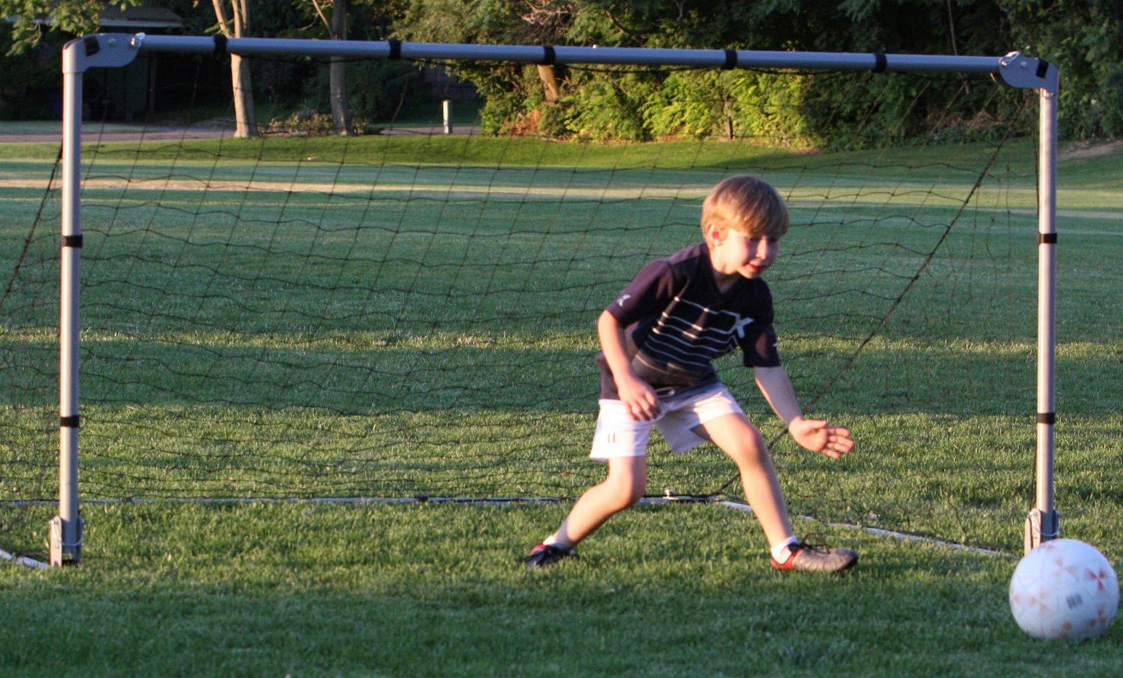 Let your kids exercise and enjoy the outdoors with a Soccer Goal from Lifetime Products. The portable, folding design makes it simple to use, and easy to transport, carry and store. Made of heavy-duty, 18 gauge powder-coated steel, the Lifetime Folding Soccer Goal is fully-assembled and adjusts to three different sizes giving your soccer star the variety and adaptability necessary to really enjoy the game. Lifetime's adjustable height portable soccer goal comes with 5 anchor hooks to stake it into the ground for stability and a heavy-duty nylon net. The net is pre-threaded onto the frame and comes with 6 velcro straps to secure it in place. Extra straps are also included to tighten the net and keep it taut when the goal is set to the smallest setting. It only takes one adult and a couple of minutes to erect this adjustable height portable soccer goal. No assembly or tools required.