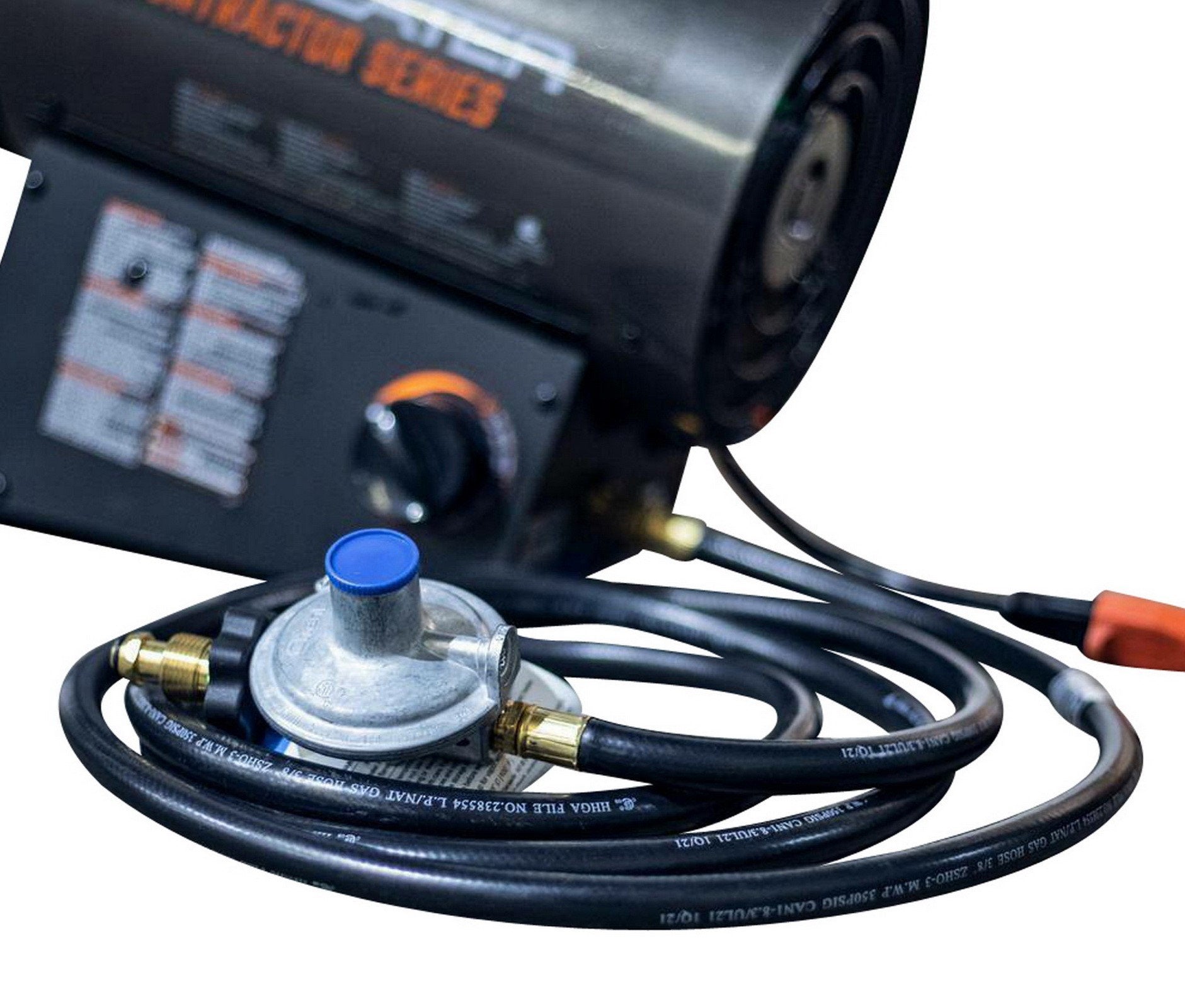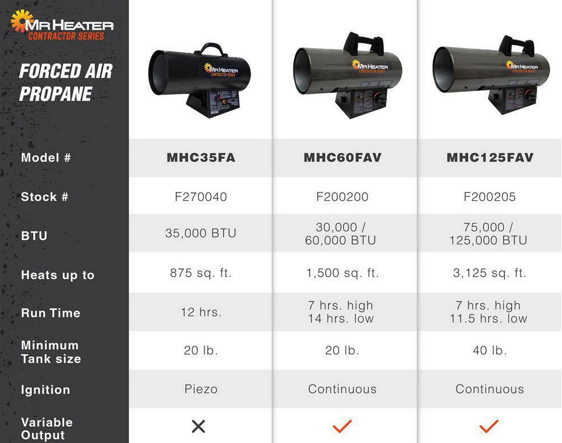 The Mr. Heater MHC60FAV portable forced air propane heater is variable from 30,000 up to 60,000 BTUs equipped with all of the safety features you have come to expect from a Mr. Heater product. A high limit safety switch and thermo-electric safety valve will provide the user with the peace of mind to focus on the task at hand. Includes a 10 ft. hose and regulator assembly and a large comfortable glove-friendly handle.