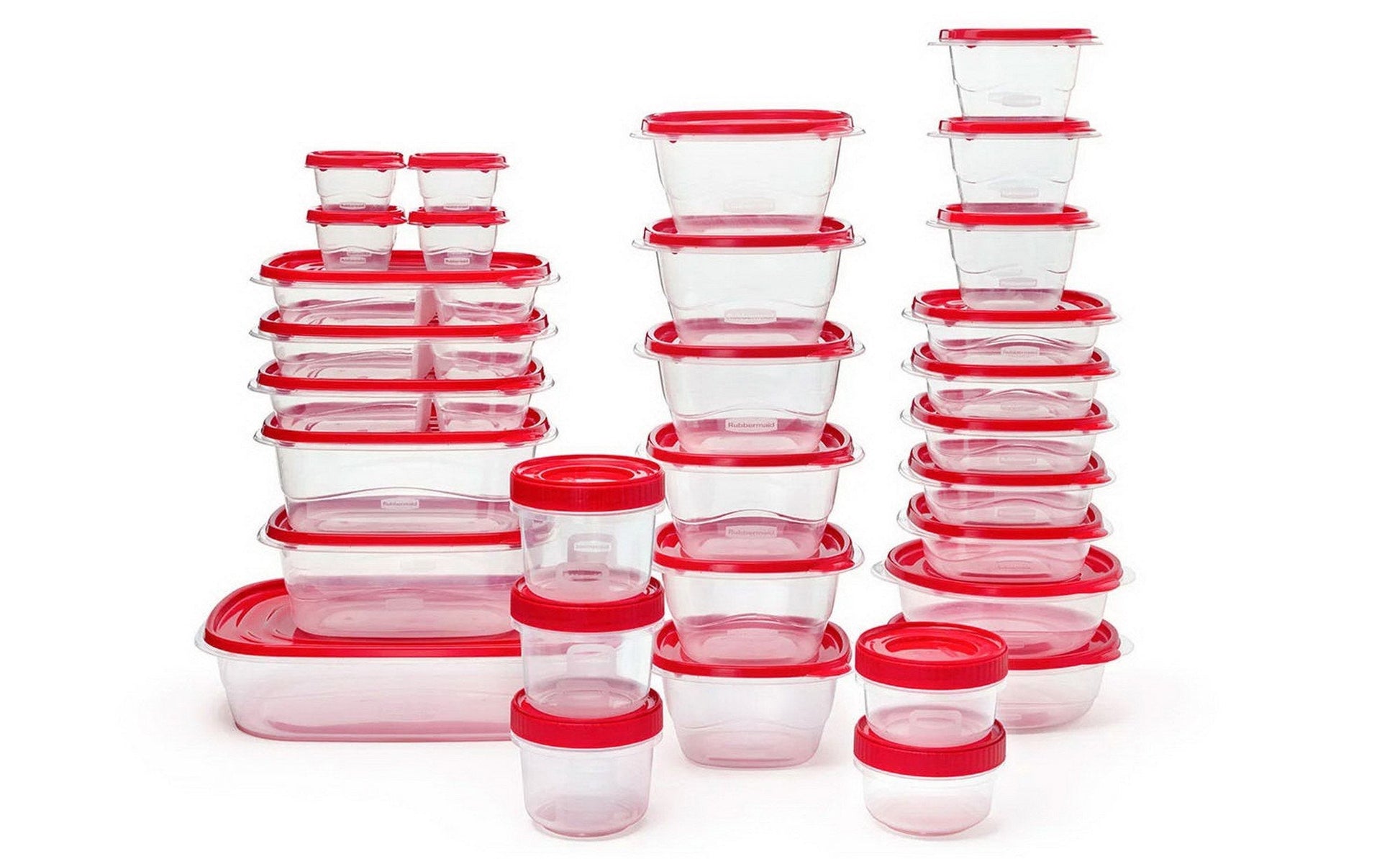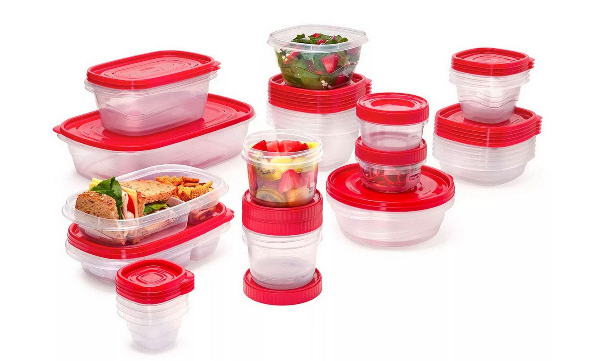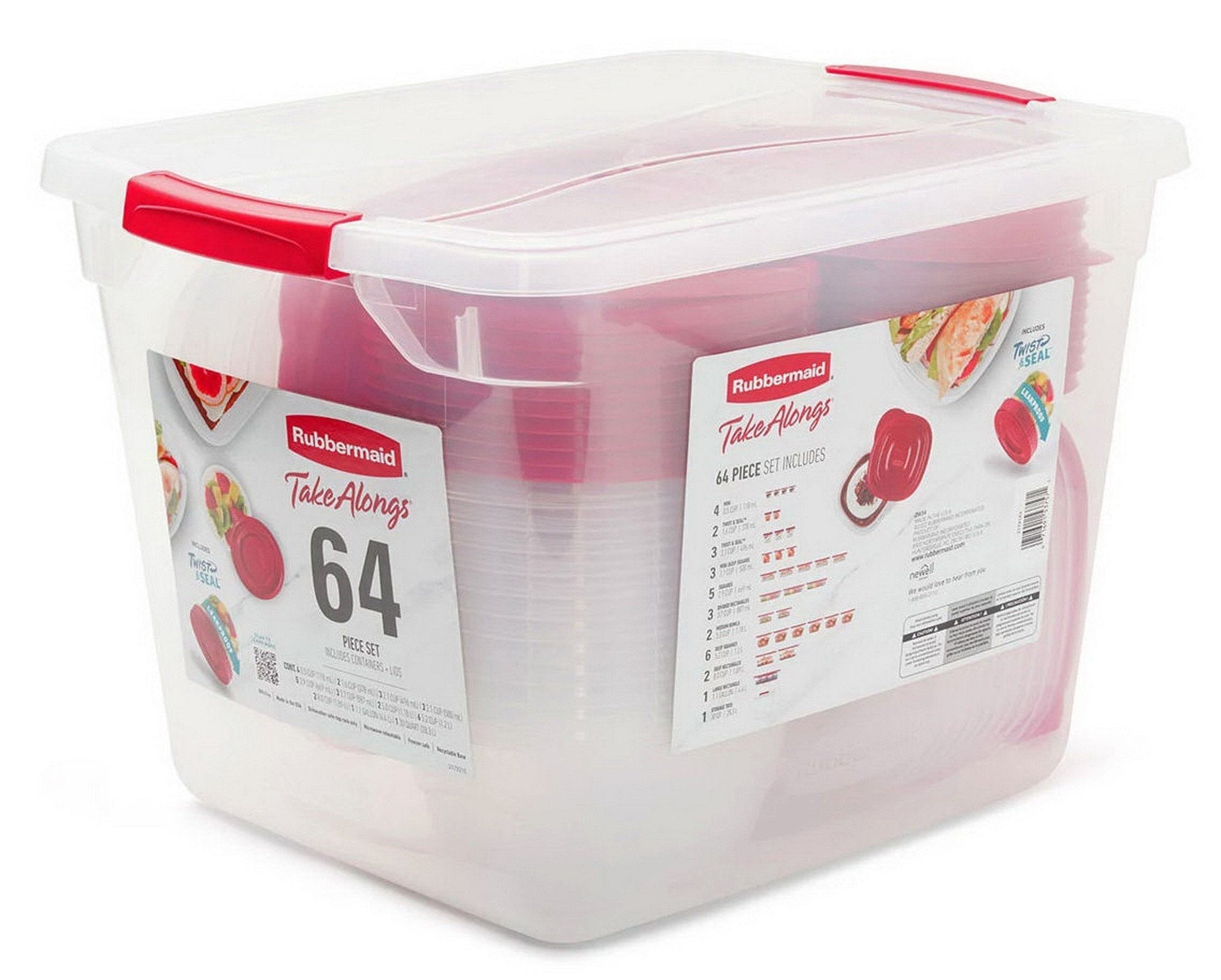 Rubbermaid 64 Piece Food Storage Containers Set Plastic Take Alongs has everything you need to take your food storage game to the next level. Picnics, school lunches, sports games, meal prep, potlucks and family gatherings all call for a variety of containers in all shapes and sizes and this Rubbermaid storage set provides just that. Thanks to our trusted Quick Click Seal and improved leakproof Twist & Seal lids, you can travel with soup, salad dressings, and other liquids worry-free. The entire system is easy to store. Lids and bases stack to save space (and for easy travel) and the giant 30-quart tote fits it all. They're BPA-free, top-rack dishwasher- and freezer-safe, and bases are microwavable. Rubbermaid products are designed with you in mind—we really do think of everything.
