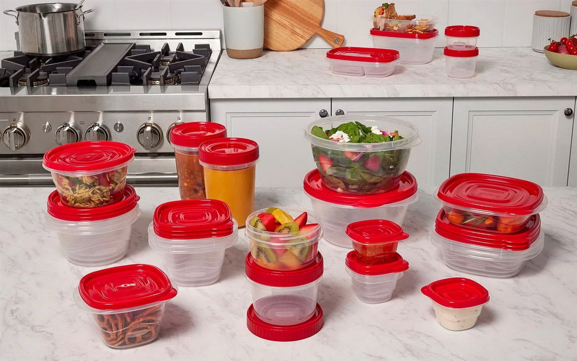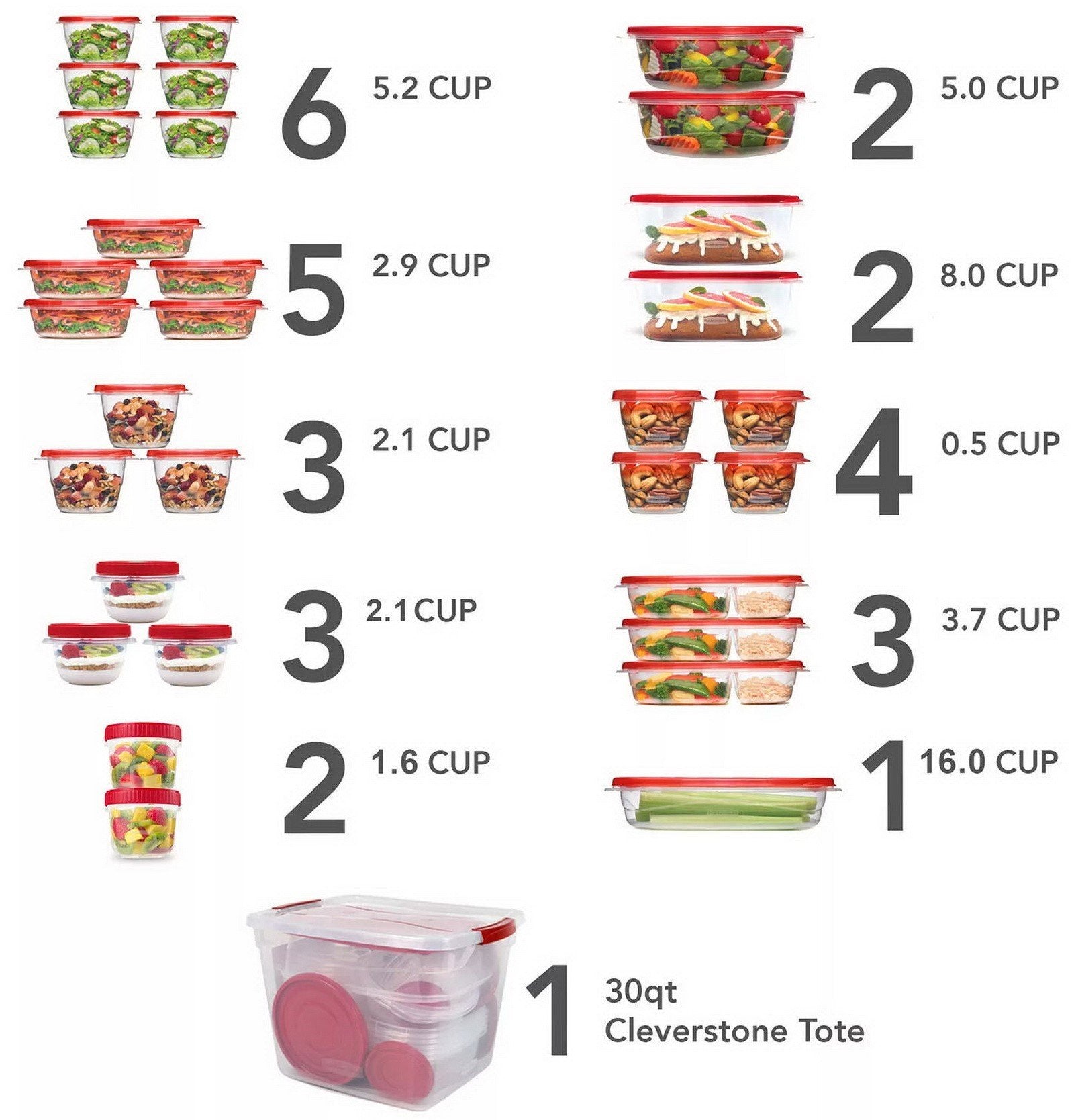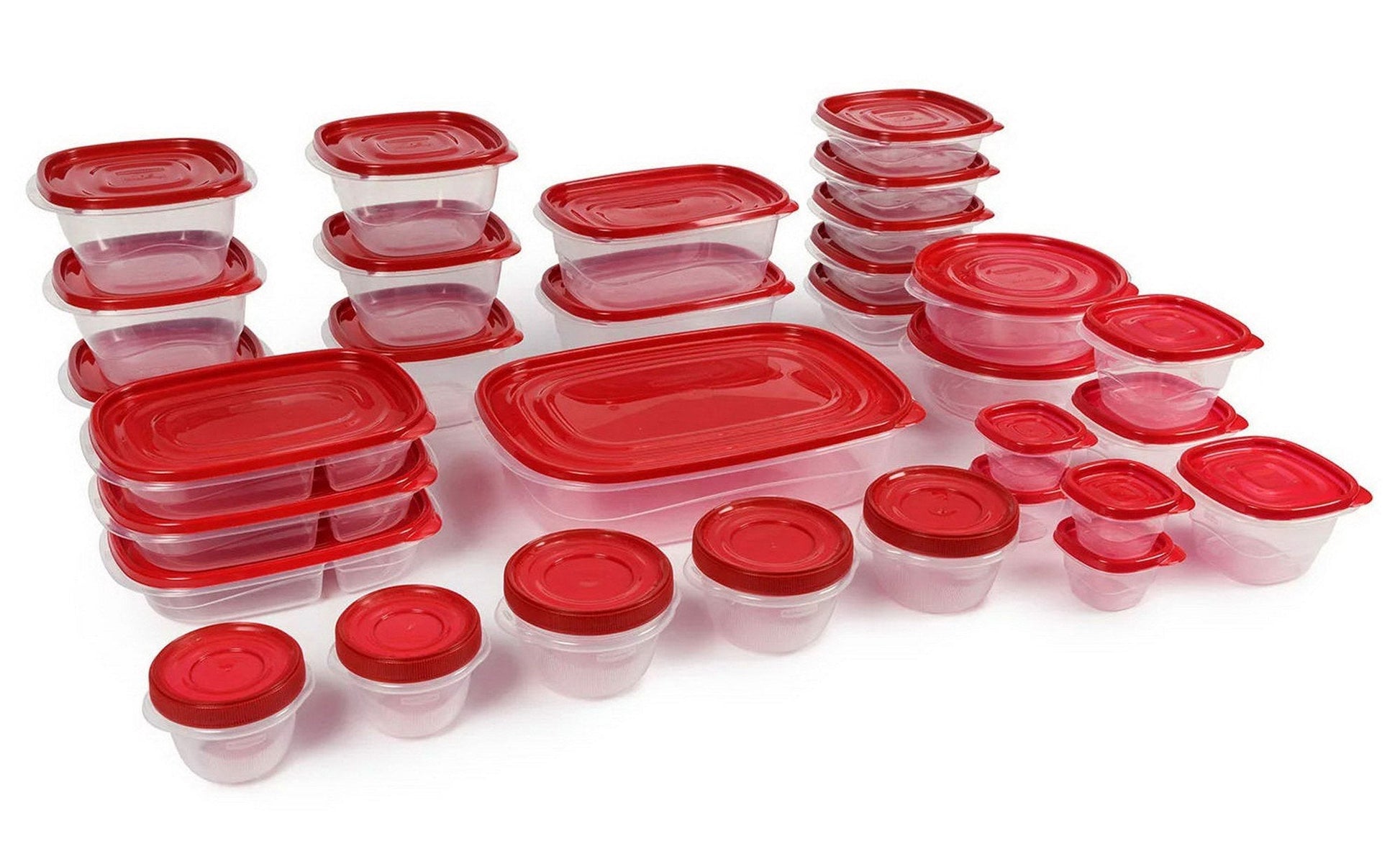 Rubbermaid 64 Piece Food Storage Containers Set Plastic Take Alongs contains a wide range of sizes, for everything from the giant container of Thanksgiving mashed potatoes to the tiny cup of leftover pine nuts. This set will comfortably have room for an entire dinner for up to 15 people, with individual containers for each dish to keep everything fresh and separated—the pasta won't mix with the olives, the bread won't get soggy from the salad dressing and the lettuce won't get wilted from damaging heat or air.