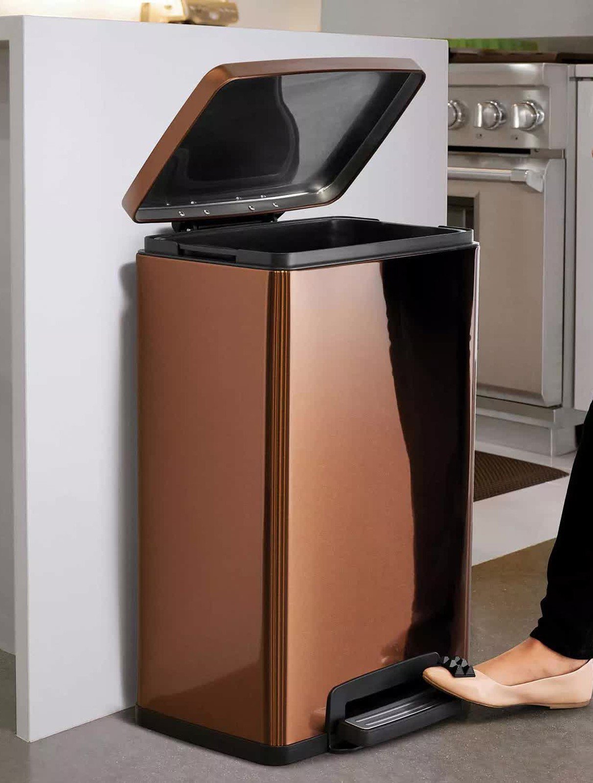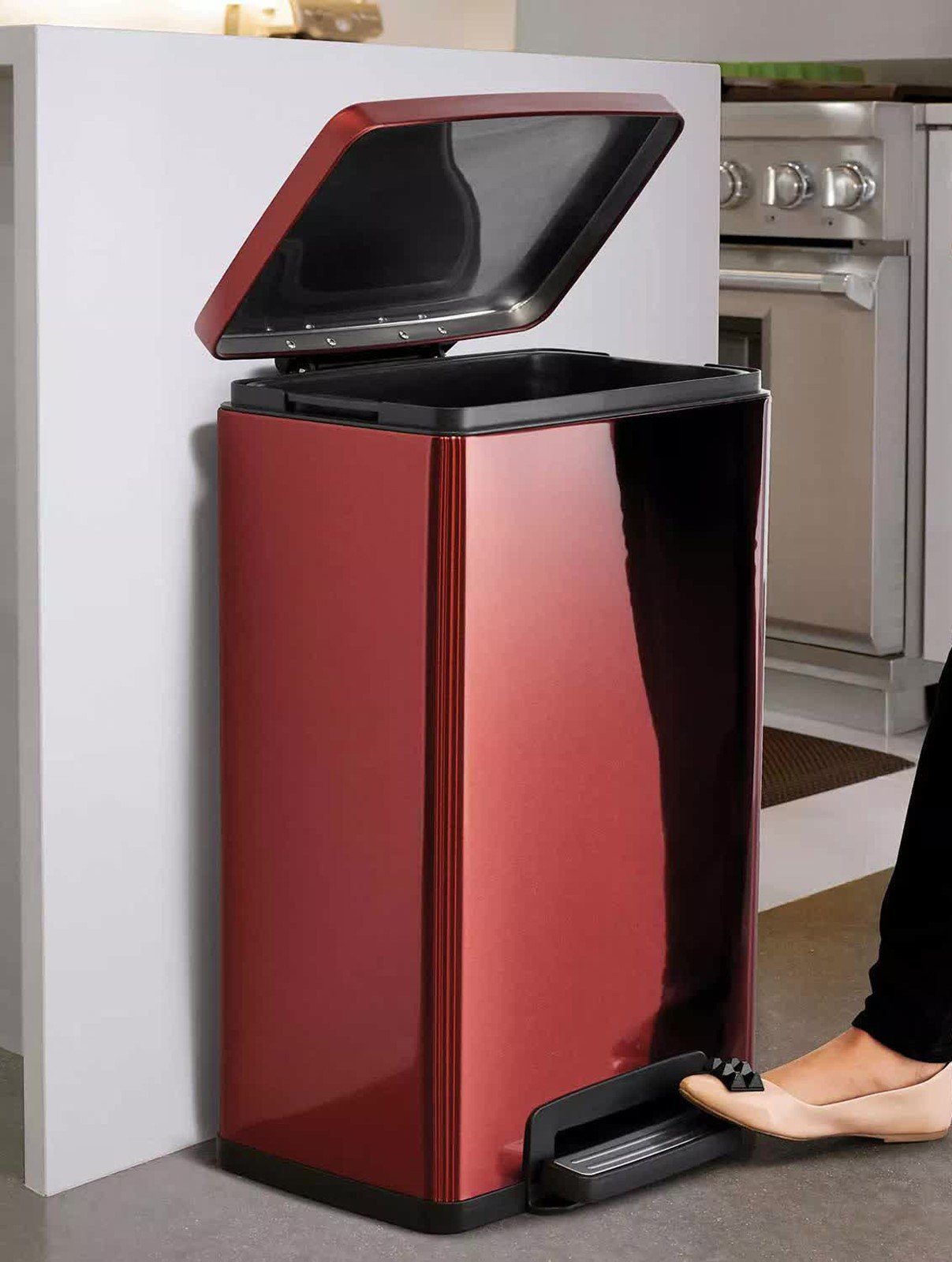 With a satin finish in durable Stainless Steel that's easy to maintain, this step trash can is as stylish as it is functional. The finish is also finger print and stain-free, making it even more effortless. The space-saving rectangle shape lets you place this can in a range of corners or nooks. The removable liner features a vented base and the trim ring conceals any bag overhang. The plastic base also prevents damage to floor. Heavy-duty hinge construction and a sturdy pedal provides easy step open access. Features: