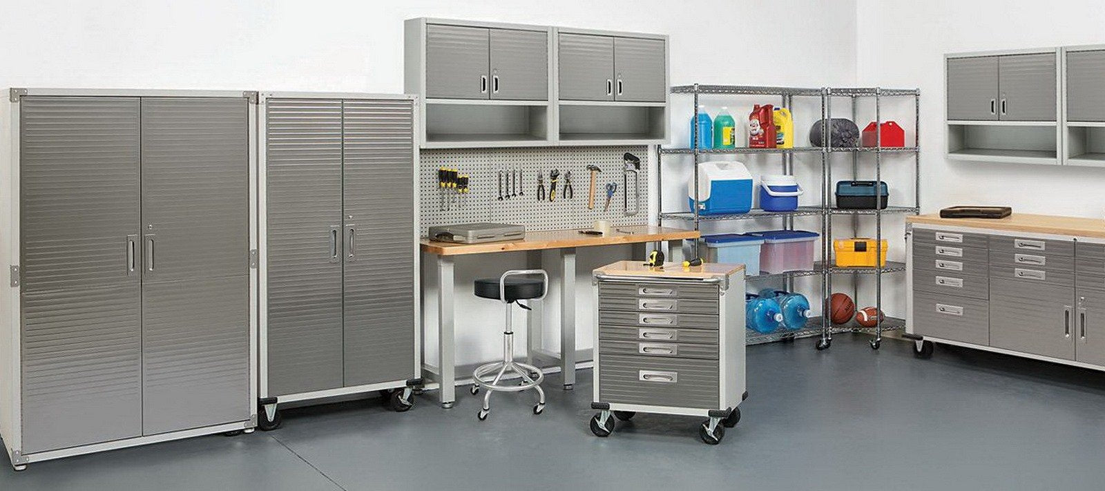 Store anything from tools and books to water jugs and non-perishable foods, this versatile storage cabinet can stand up to the stress. Quality powder-coated construction, stainless steel doors, high-quality casters and hardware provide an economical, stylish answer to your garage organization project. And it's built to last, too.