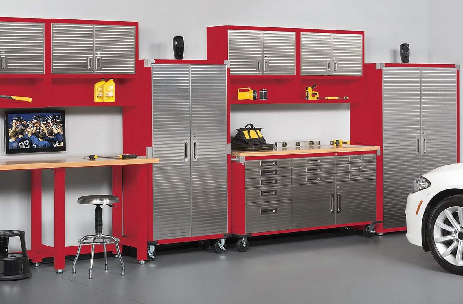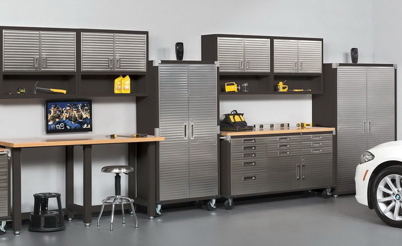 - Powder-coated construction and stainless steel doors provide an economical, stylish answer to your garage organization project
