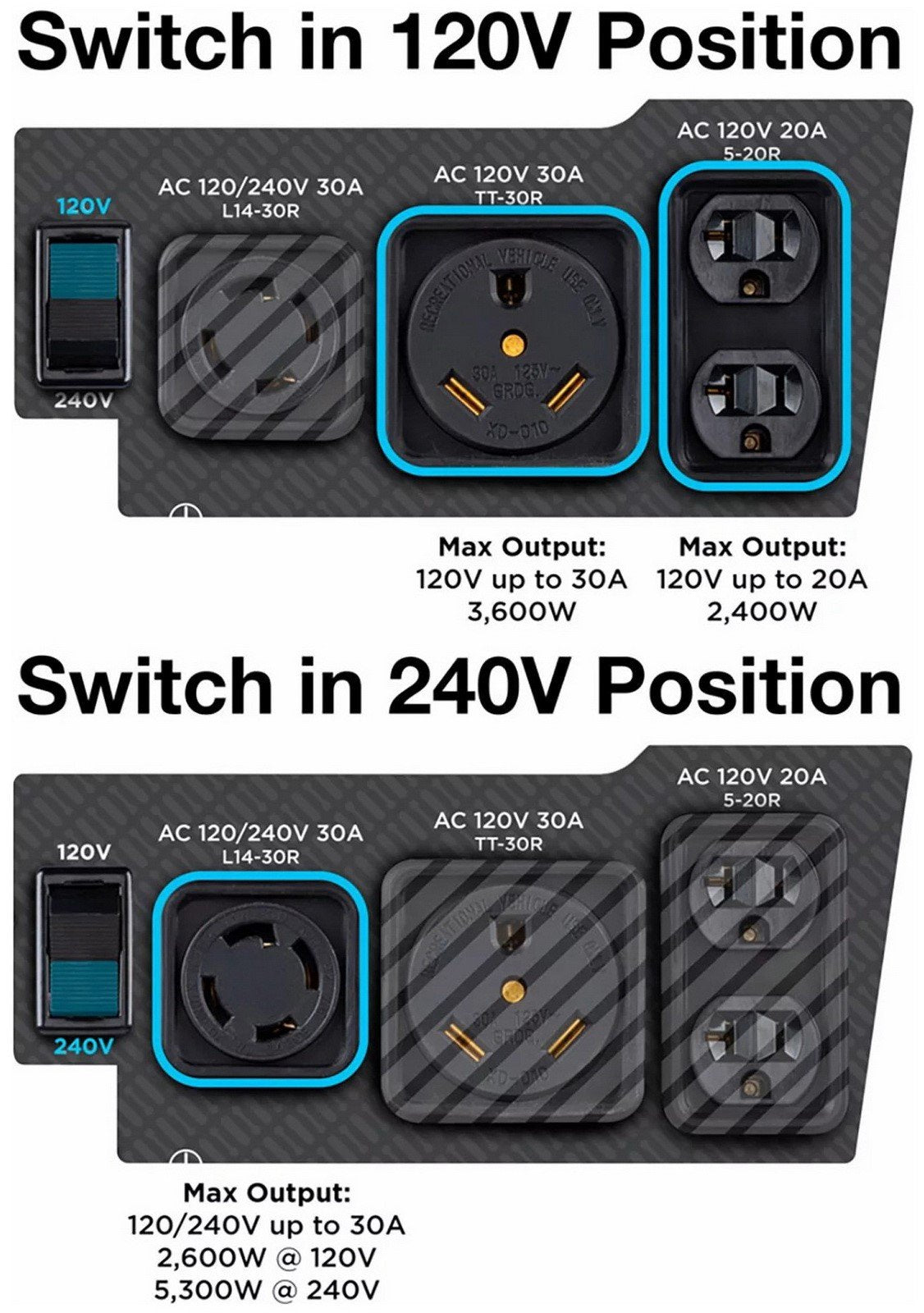 Running for up to 14.5 hours on a 4.7 gal. (18L) tank of gas, it's conveniently equipped with a built-in fuel gauge, and Push-Button Electric Start with a remote start key fob. The L14-30R outlet is Transfer Switch Ready to supply total household power which eliminates the hassle for annoying extension cords or power strips. Combined with an RV Ready TT-30R outlet, you can ensure your recreation vehicle or home is ready to go for air conditioners, refrigerators, sump pumps and other home necessities. The intuitive control panel features an adjustable 120/240 Volt Selector Switch to draw more power with added flexibility for higher voltage appliances like well pumps.
