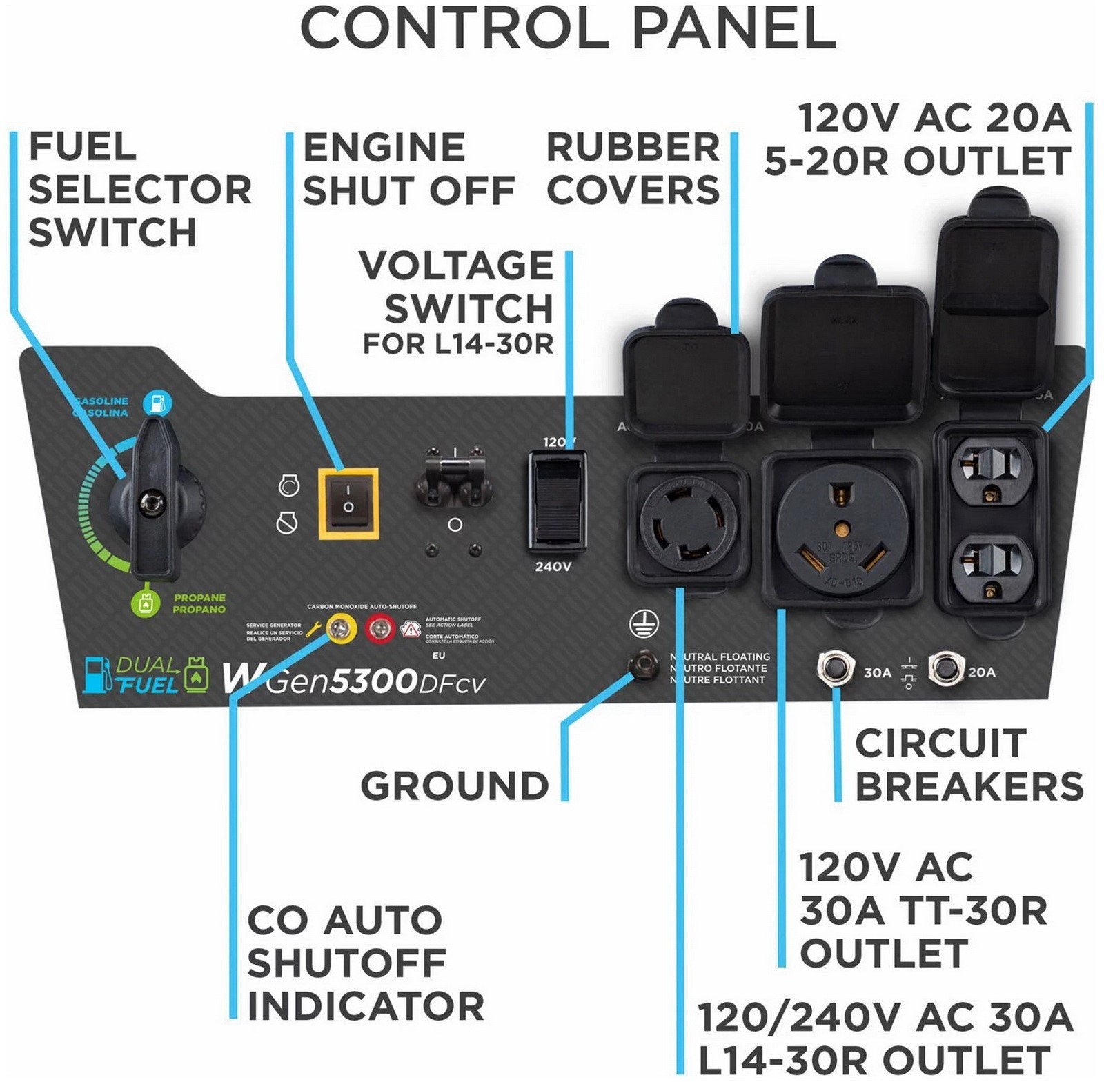 The WGen5300DFcv features a powerful 274cc 4-Stroke OHV Westinghouse Engine with a cast iron sleeve designed for durability, featuring a built-in fuel gauge and automatic low oil shutdown. It’s equipped with an RV Ready TT-30R 30A outlet that conveniently hooks to your travel trailer, keeping the air conditioner and travel necessities up and running all day long. Easy to maneuver, it's constructed with a hardened steel frame and never-flat wheels. Combined with an L14-30R outlet, the generator is Transfer Switch Ready for total household power and eliminates the hassle for annoying extension cords or power strips for your home.
