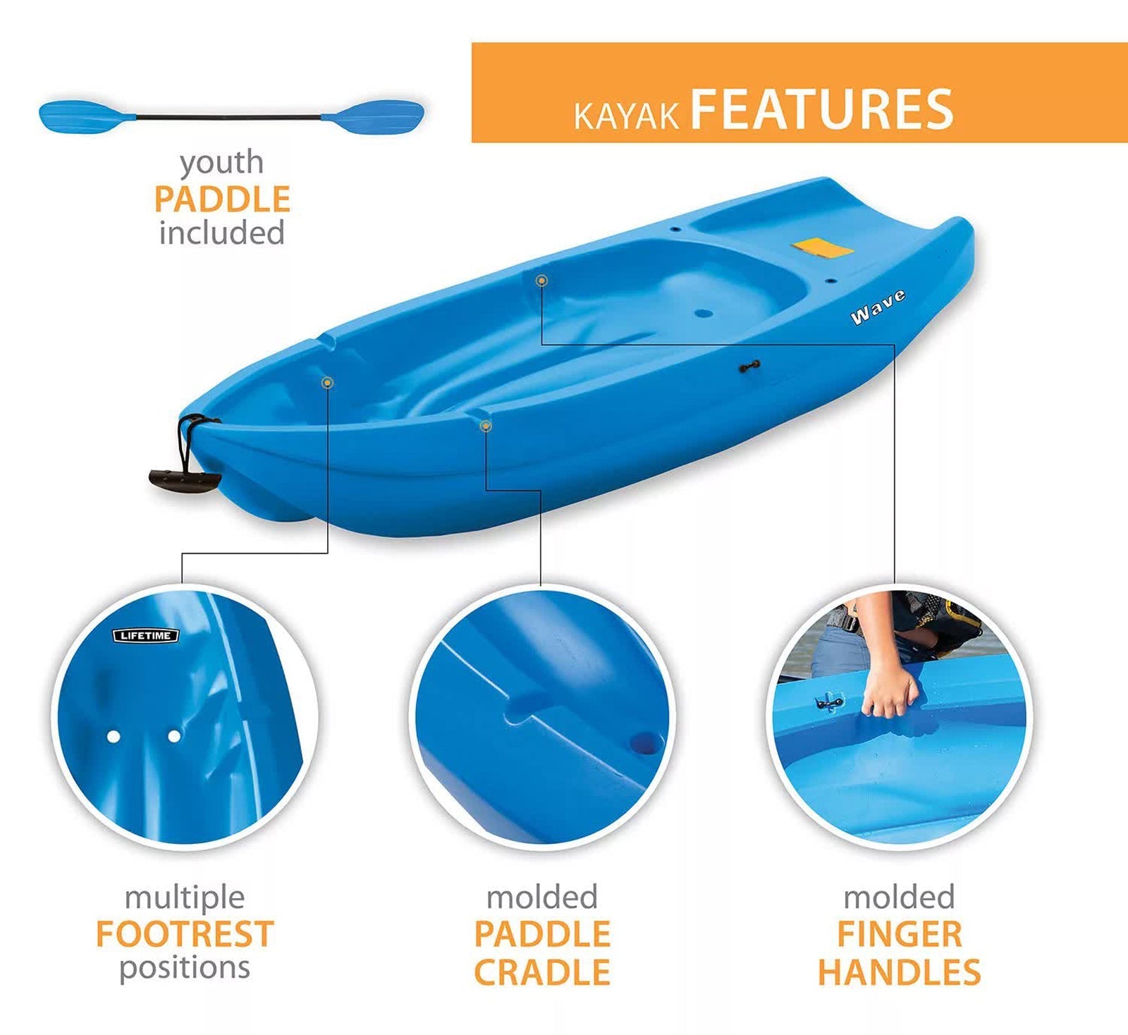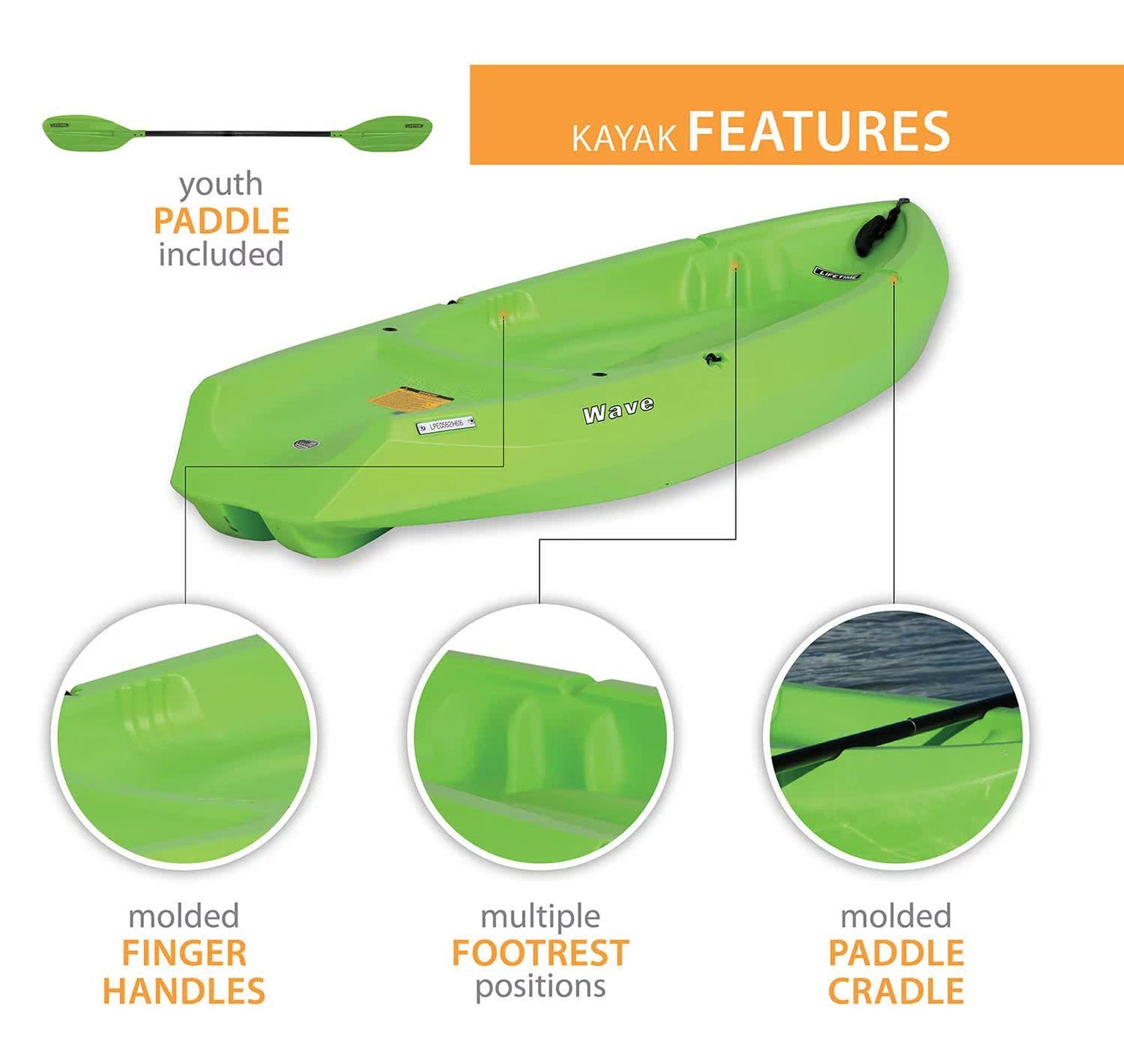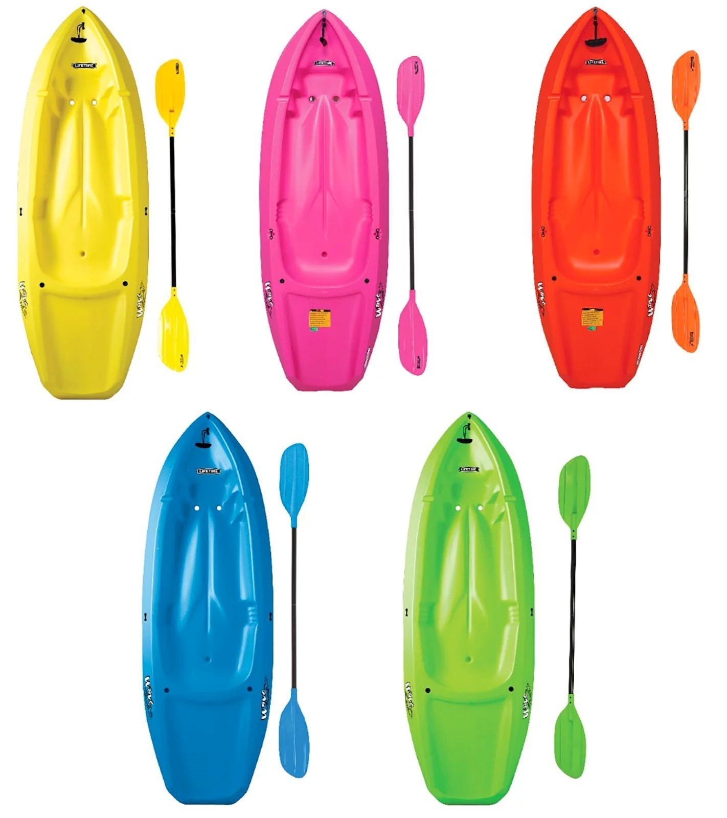 - Lifetime Wave Kayaks - The 6 ft. youth Wave Kayak has a 130 lb. weight capacity and comes in Blue, Green, Orange Pink or Yellow. A black double-sided paddle and a 5-year limited warranty are included.
