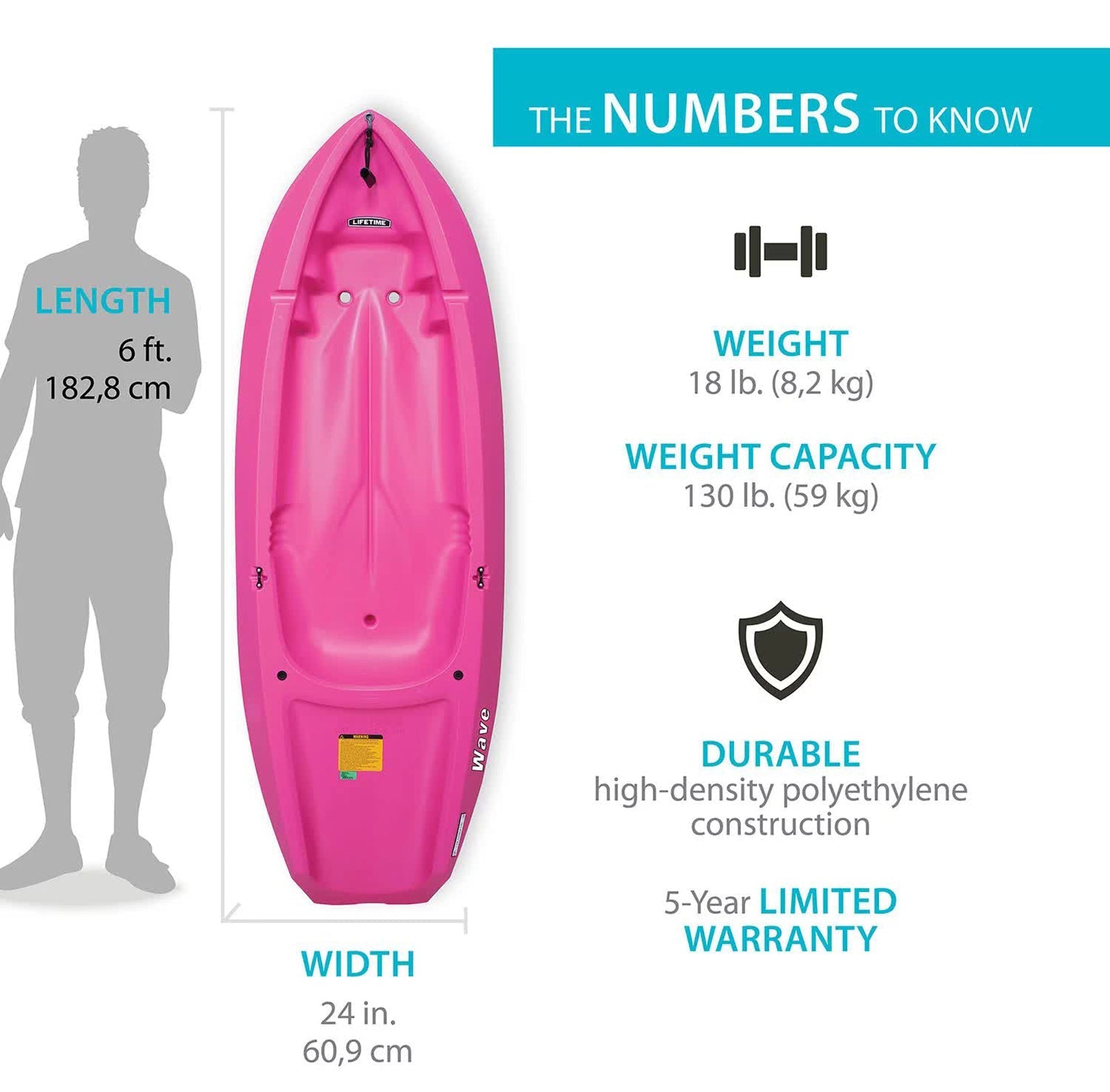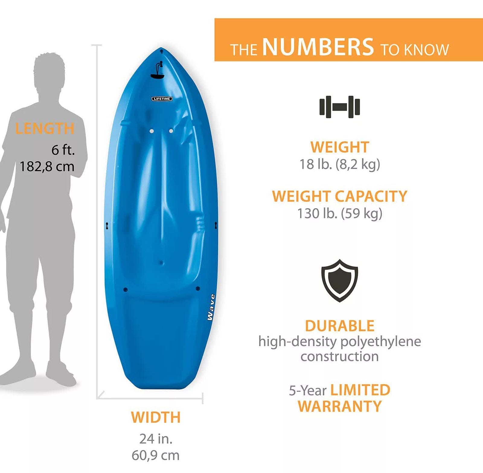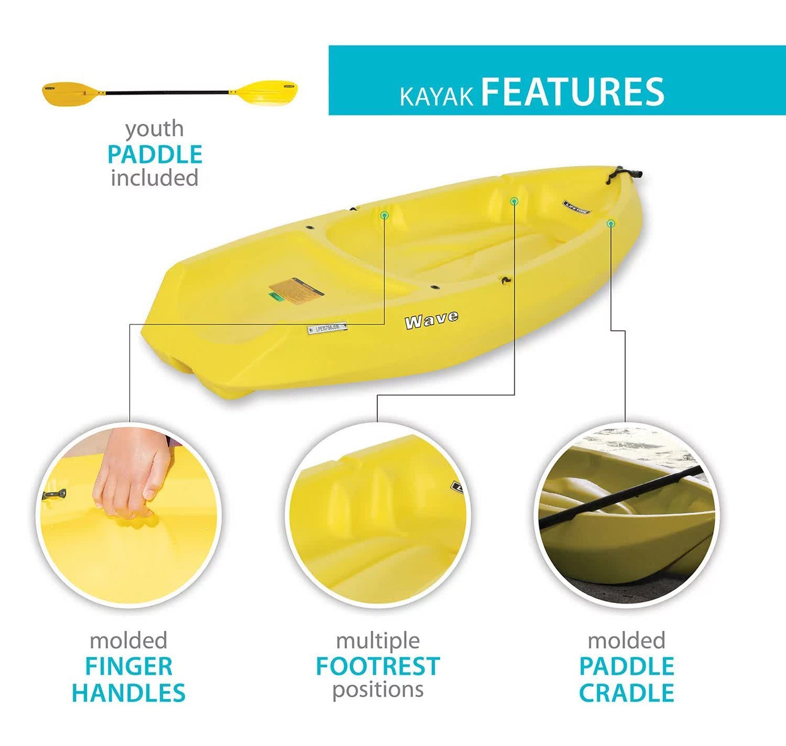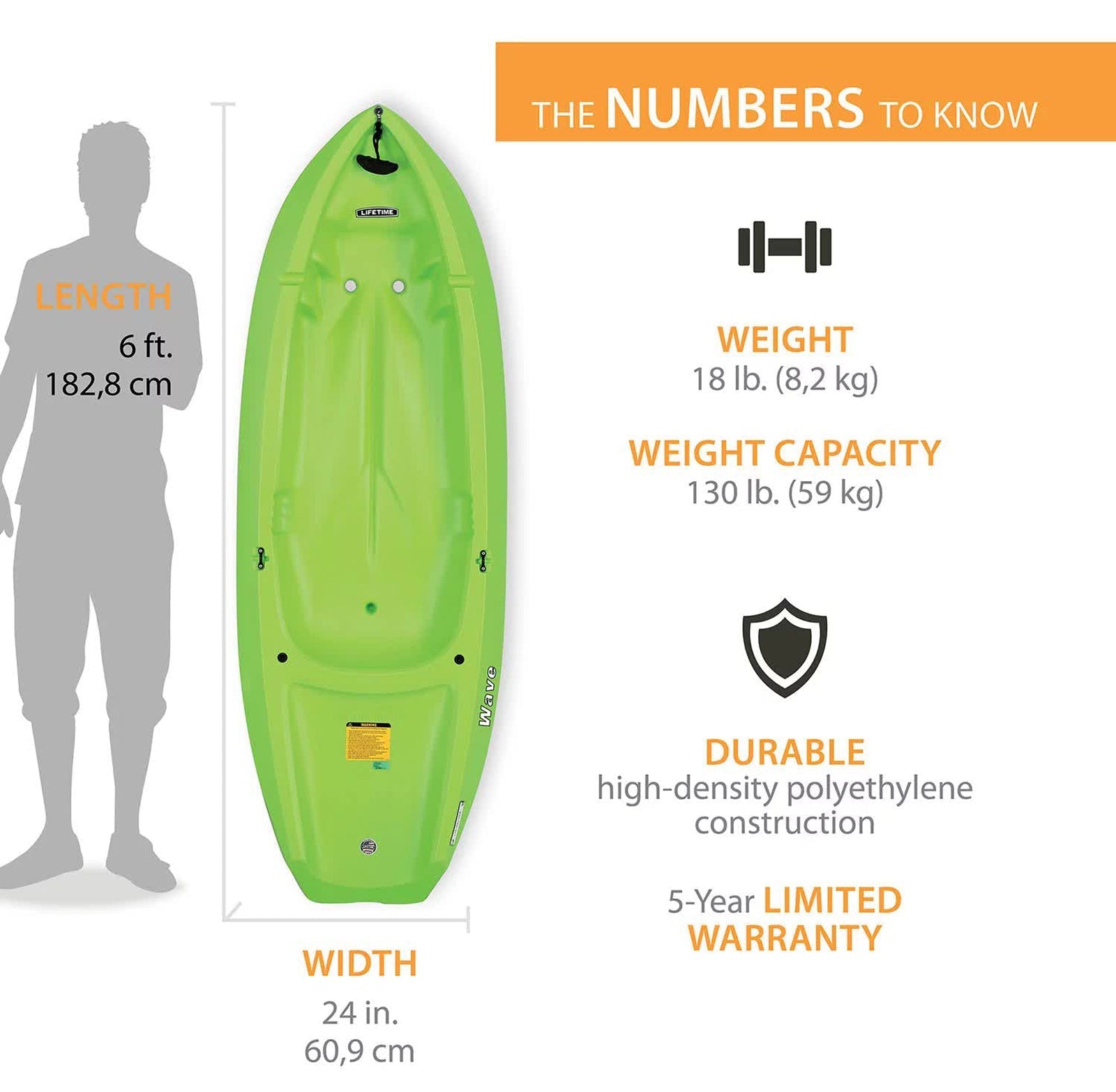 - Lifetime Wave Kayaks - The 6 ft. youth Wave Kayak has a 130 lb. weight capacity and comes in Blue, Green, Orange Pink or Yellow. A black double-sided paddle and a 5-year limited warranty are included.