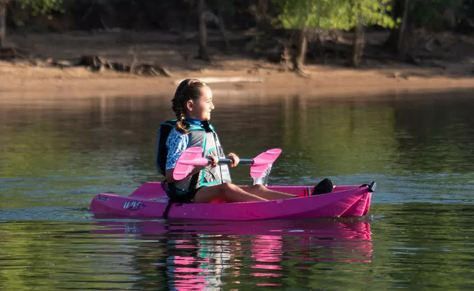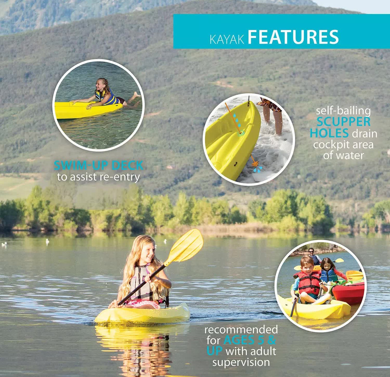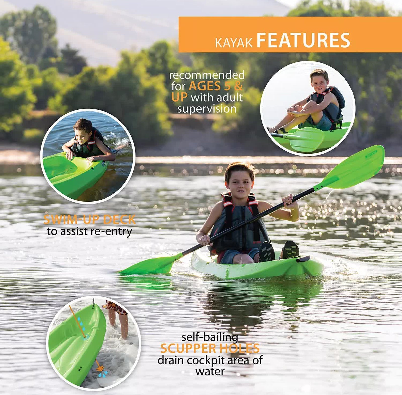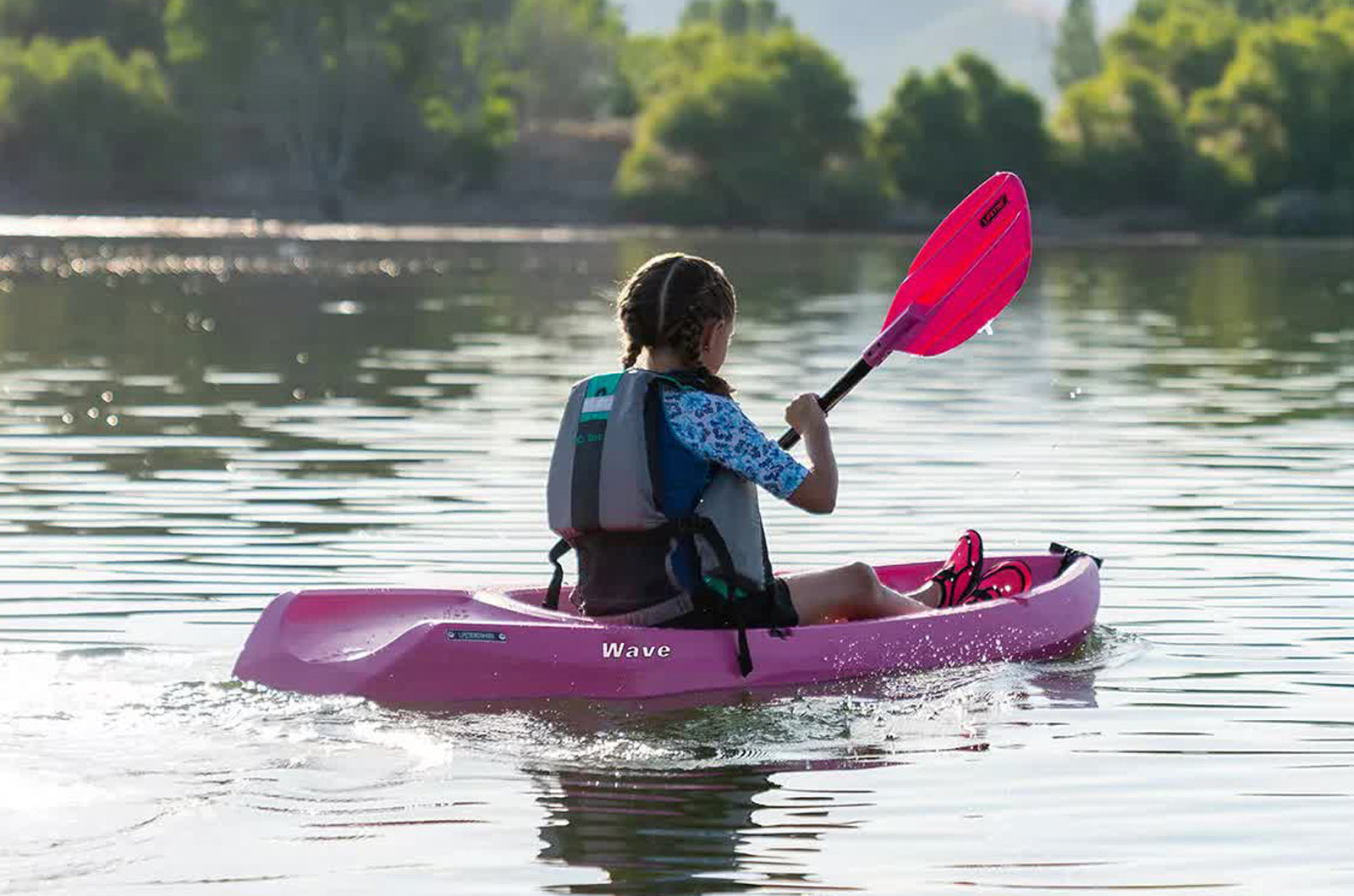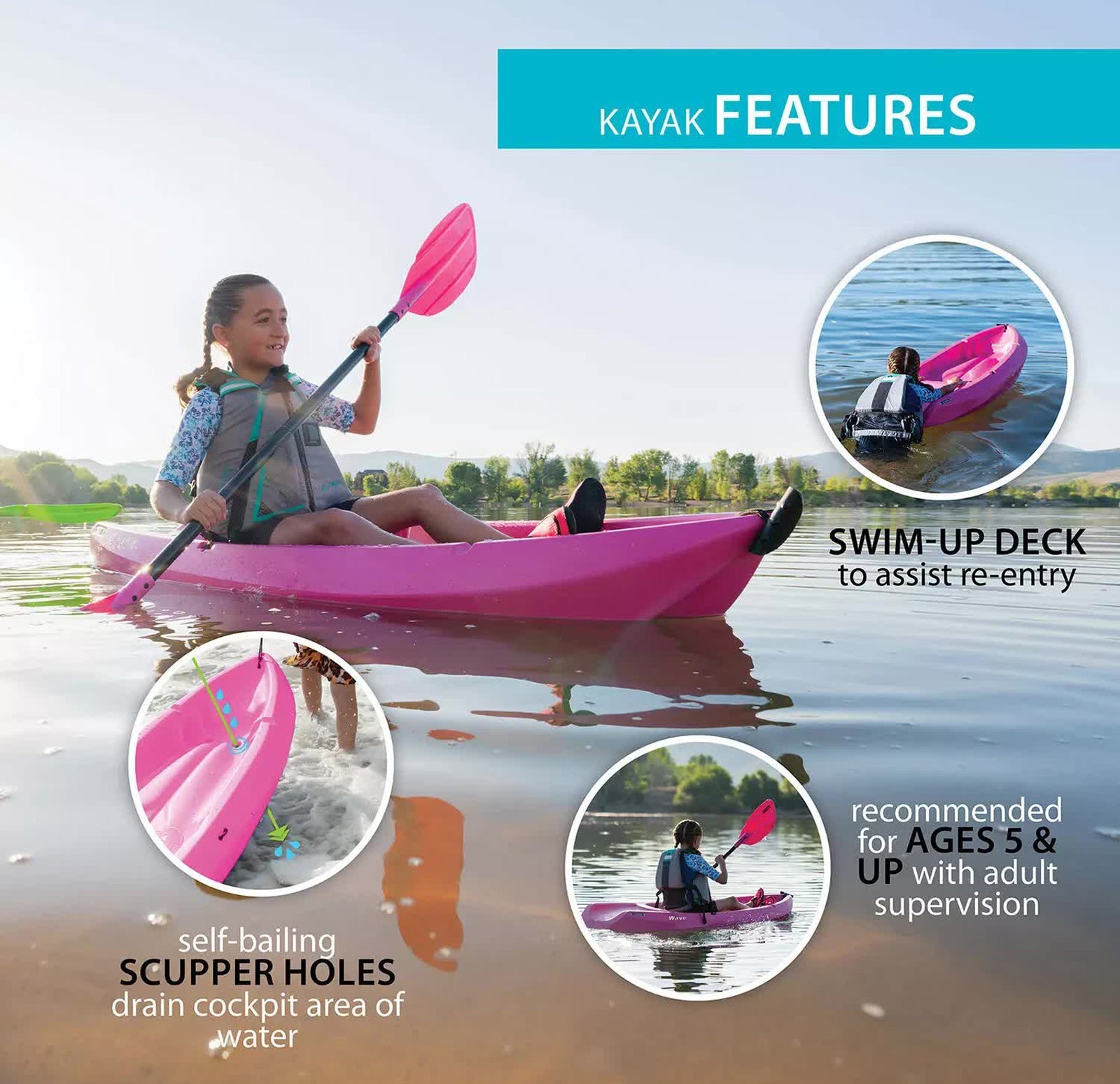 The 6 ft. Lifetime Wave Kayak is specifically designed for kids ages 5 and up, or up to 132 lbs. The wide stance provides a stable paddling platform to keep your child safely in the kayak. Its sloped backend and swim-up step allows the rider to easily re-enter the kayak from the water. With scupper holes, multiple footrest positions and great stability, the Wave is perfect for kids' recreational kayaking.